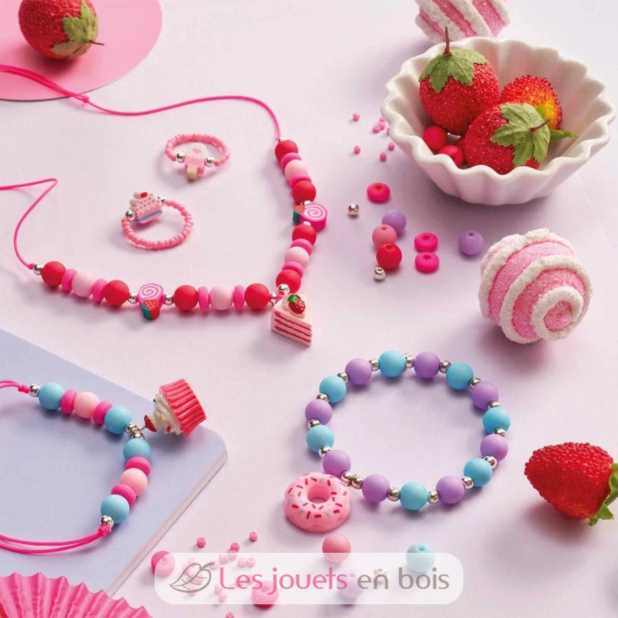 In totale, i bambini possono realizzare 1 collana, 2 braccialetti e 2 anelli utilizzando il contenuto di questa scatola creativa: 3 ciondoli gourmet (una ciambella, un pezzo di torta alla fragola, un cupcake), 3 perline gourmet (un gelato, un cupcake, una torta alla fragola), 35 perline rotonde, 15 perline heishis grandi, 60 perline di semi, 35 perline d'argento, filo elastico e filo rosa. È incluso anche un libretto con schemi e istruzioni per guidare i bambini nell'attività. Gli anelli di perline sono progettati in modo intelligente per adattarsi a tutte le dimensioni delle dita grazie al filo elastico!