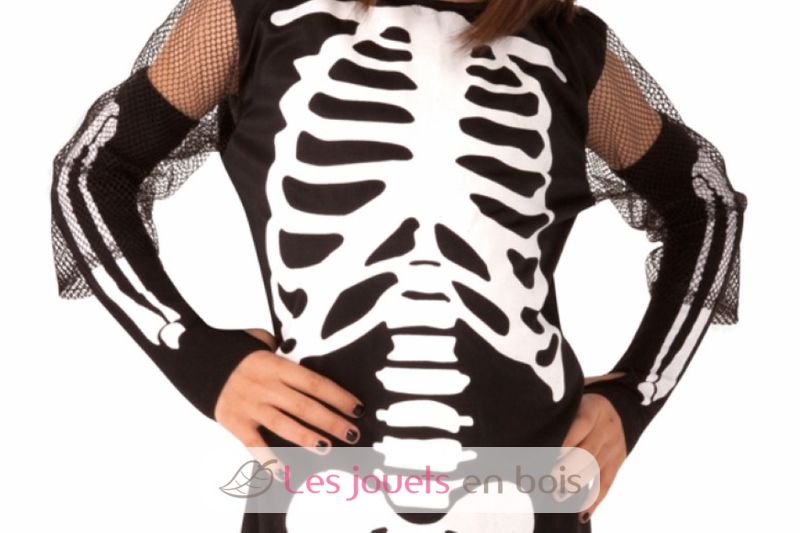 Questo costume per bambini include un abito nero senza maniche con stampa di uno scheletro bianco, un paio di polsini neri con bordo in tulle e un paio di calze stampate.