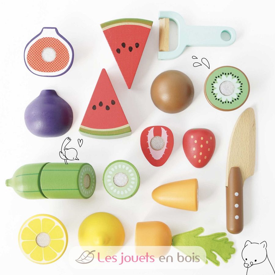 Questo set da 18 pezzi include un tagliere, un finto coltello, un pelapatate e una selezione di gustosa frutta e verdura che può essere tagliata e poi rimontata utilizzando le intelligenti chiusure in velcro.