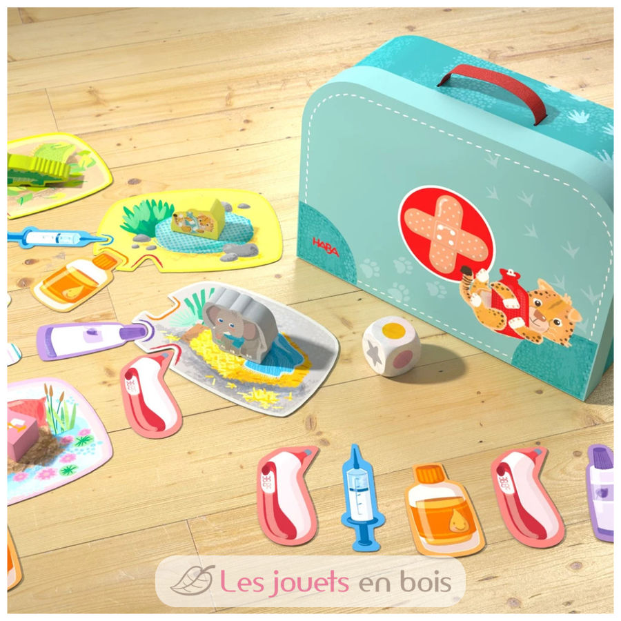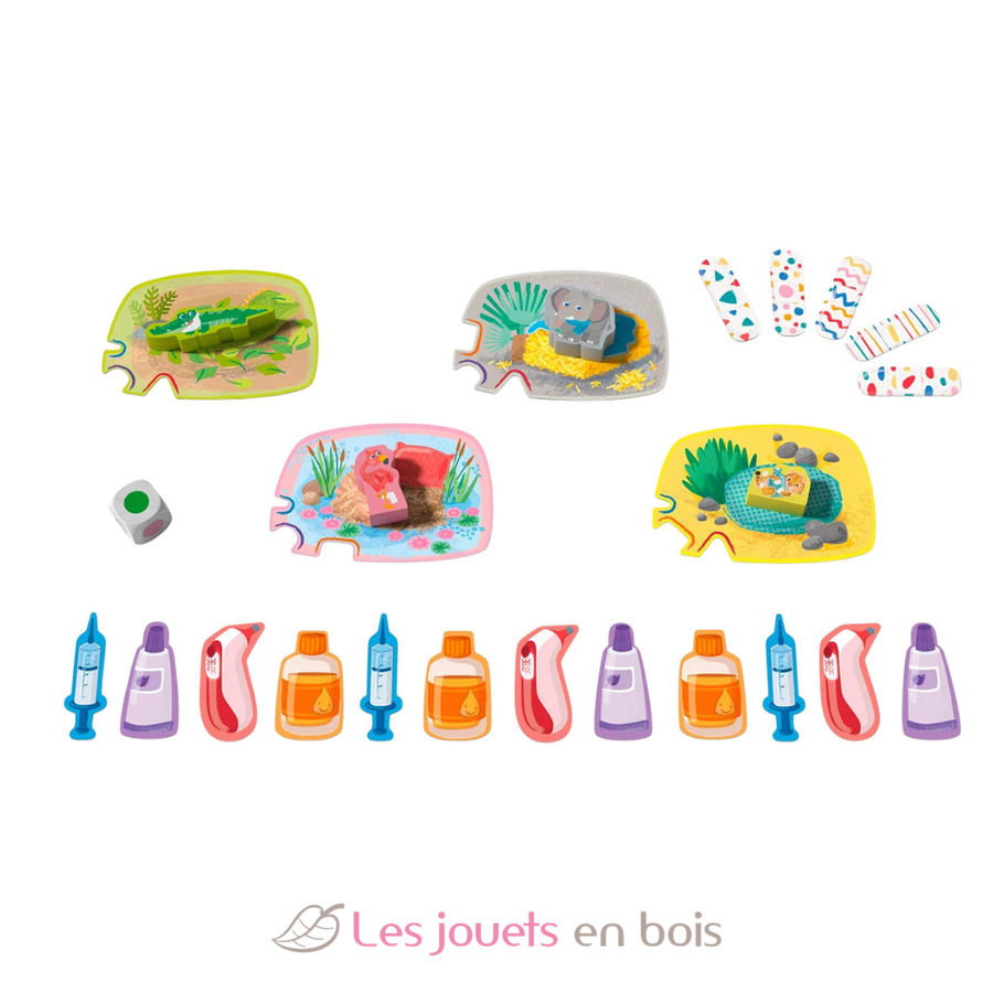 Ahi ahi, gli animali sono malati e hanno bisogno di cure urgenti. Il coccodrillo ha mal di denti, l'elefante ha il raff reddore, il ghepardo ha mal di pancia e il fenicottero si è rotto la gamba. Cosa aspettate, aff errate la valigetta del dottore e scoprite di cosa hanno bisogno gli animali! Chi riesce a trovare la cura adatta e ad associare correttamente per primo tutte le tessere medicina?