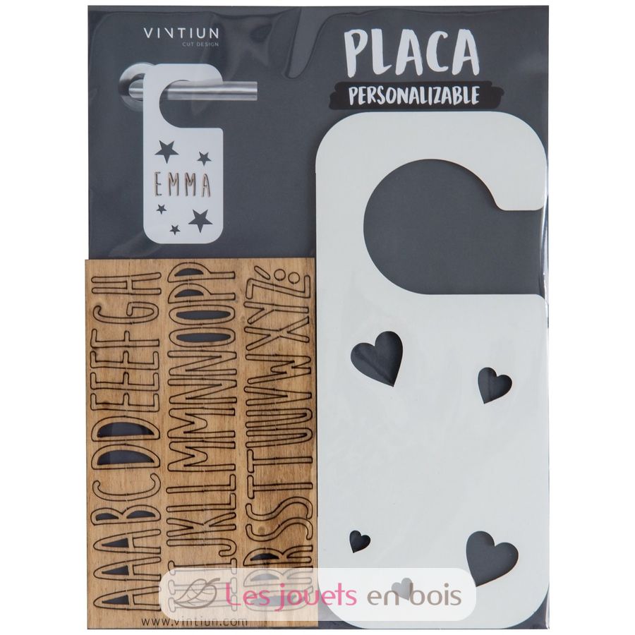 Il kit include: 1 appendino decorativo per porta in legno; 1 foglio di lettere in legno autoadesive. Dimensioni: 8,5 x 19 cm.