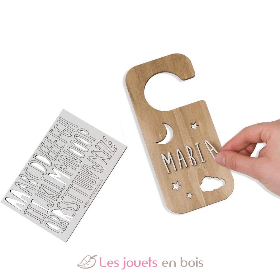 Il kit include: 1 appendino decorativo per porta in legno; 1 foglio di lettere in legno autoadesive. Dimensioni: 8,5 x 19 cm.