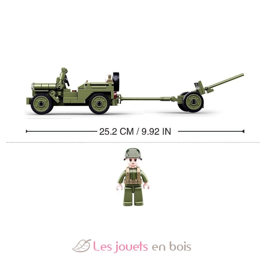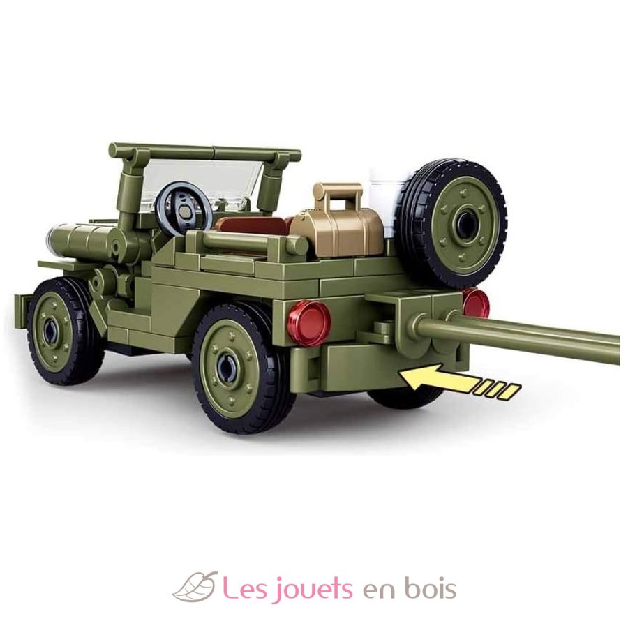 Questo kit di costruzione Sluban contiene 143 pezzi e permette di ricreare una Jeep Willys utilizzata dalle forze alleate durante la Seconda Guerra Mondiale, equipaggiata con un cannone antiaereo per la difesa dalle minacce aeree.