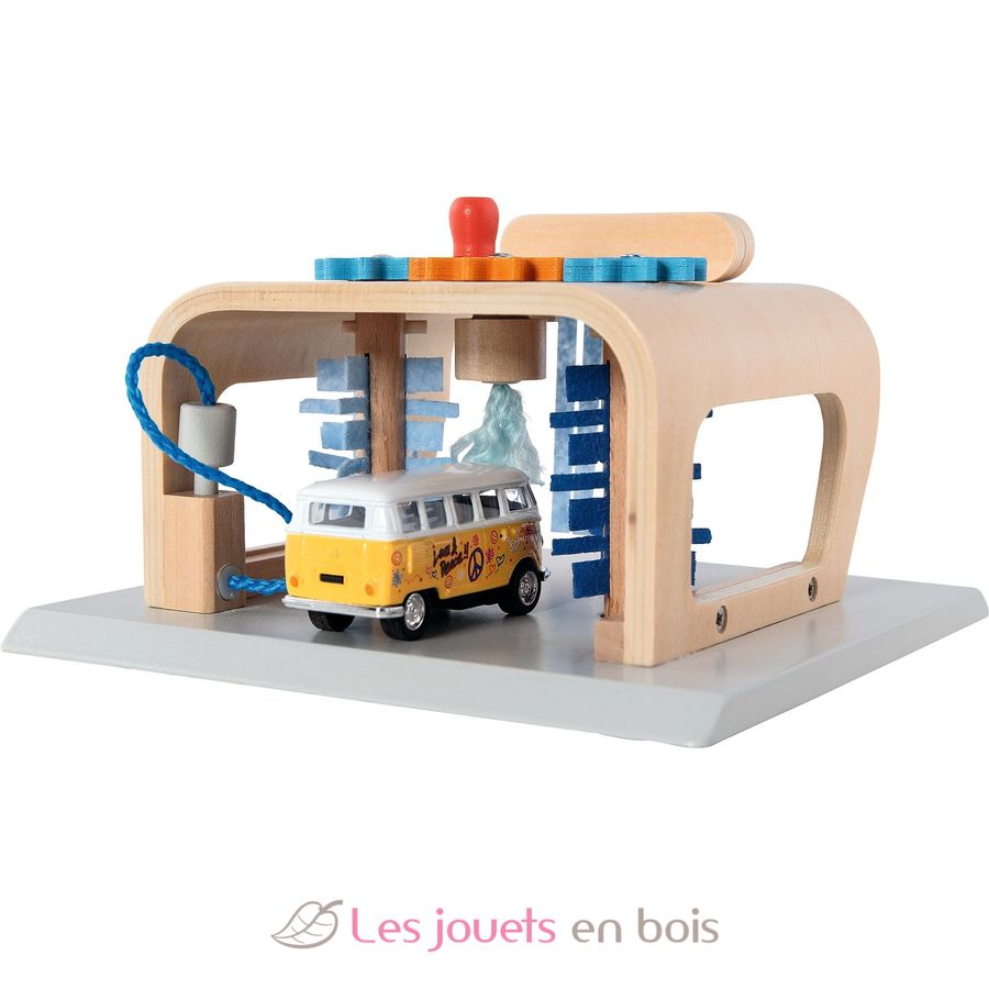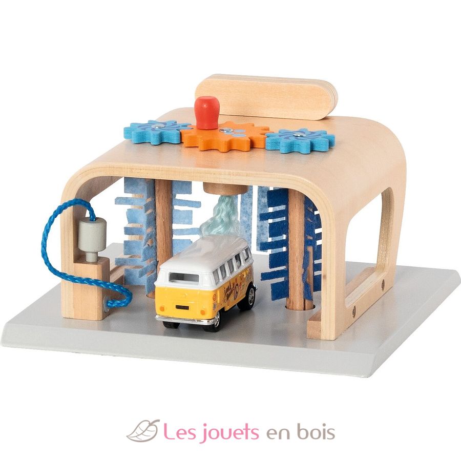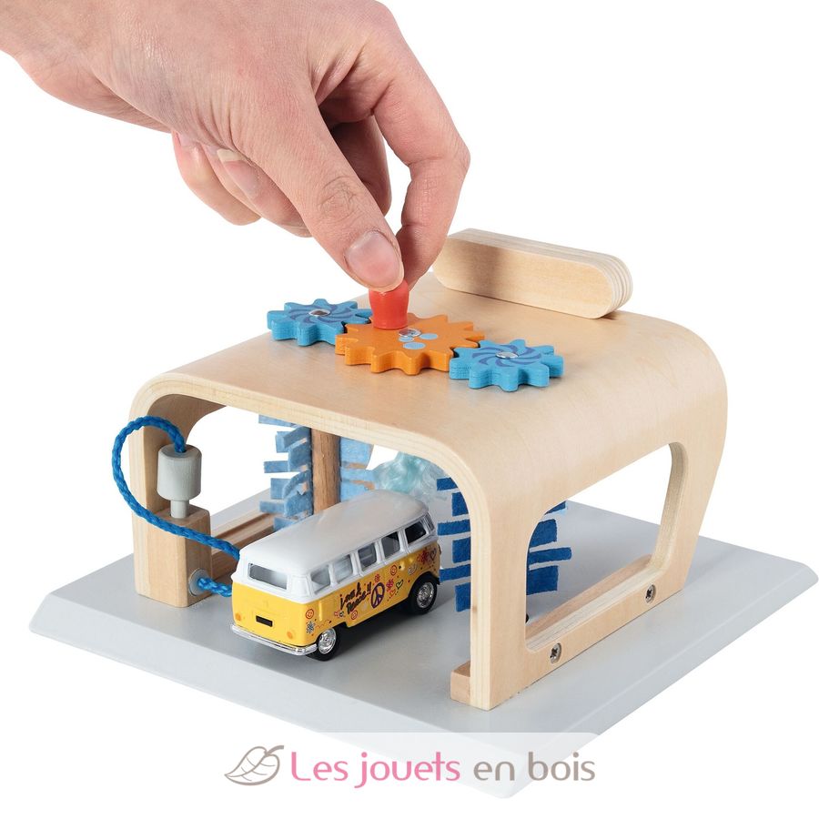 La parte migliore di questo garage in legno: basta girare gli ingranaggi sul tetto per mettere in movimento le spazzole!