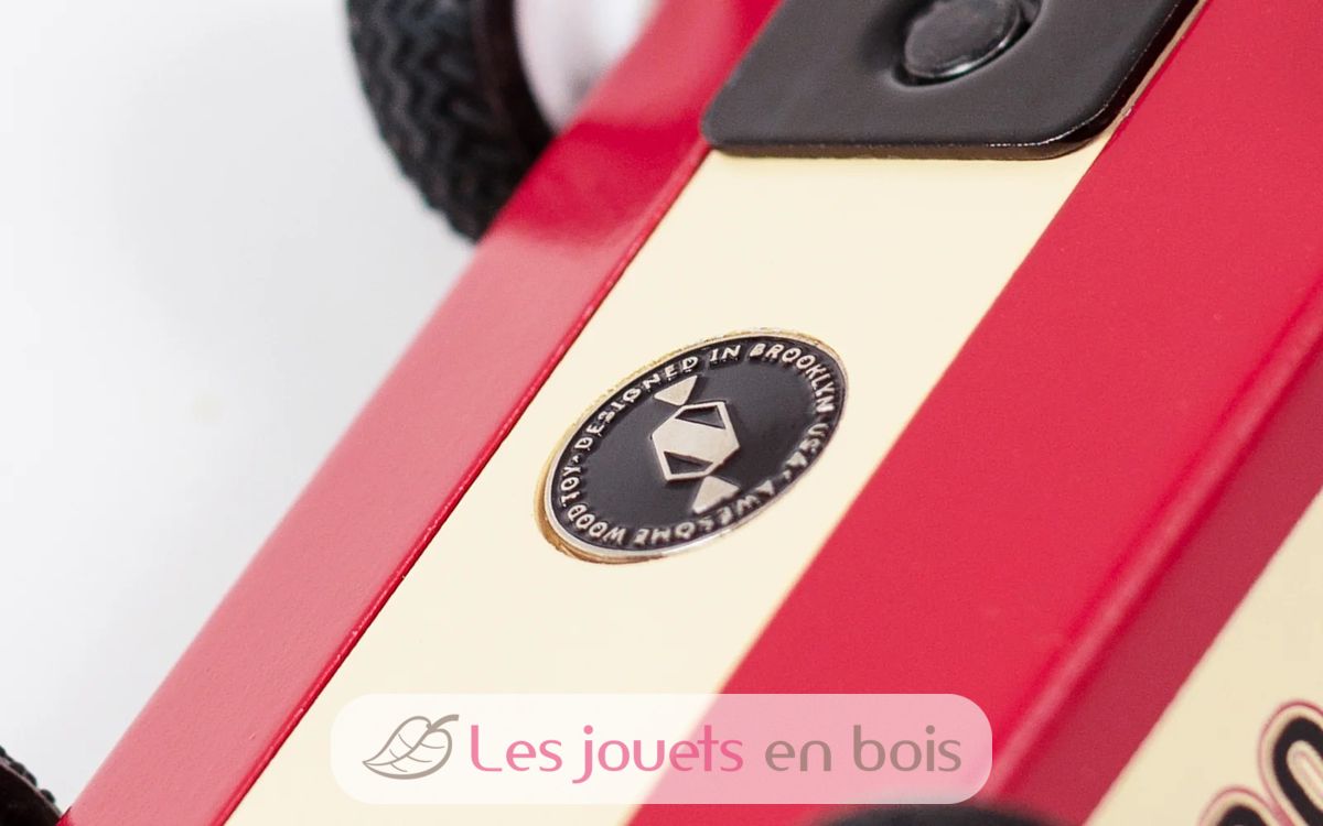Veicolo realizzata in legno massiccio di faggio, vernice a base d'acqua con rivestimento in uretano trasparente, cerchi in polimero (ABS) e pneumatici in gomma. Dimensioni: 16,5 x 9,3 x 8,1 cm.
