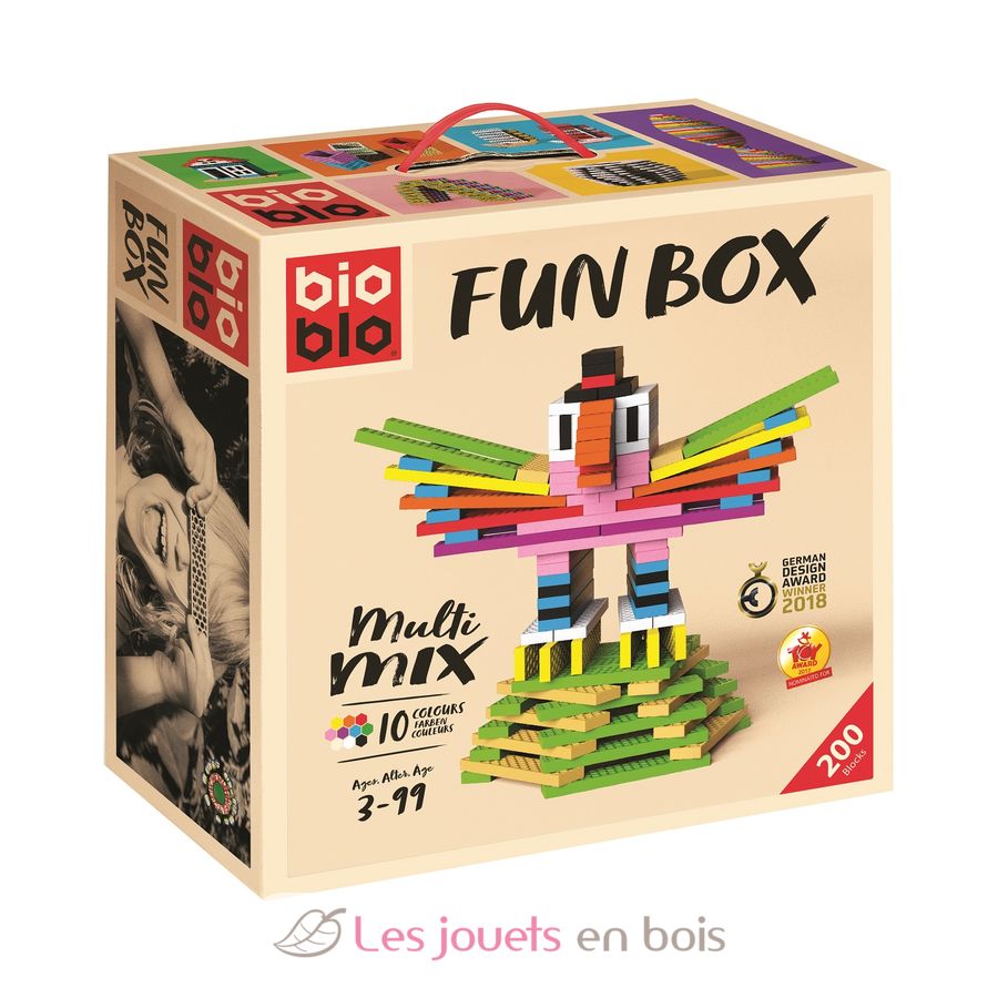 La "Bioblo Fun Box" contiene 200 mattoncini in dieci colori diversi: 20 blu, 20 gialli, 20 rossi, 20 verdi, 20 arancioni, 20 rosa, 20 viola, 20 neri, 20 bianchi e 20 beige. Tutto ciò che serve per realizzare strutture belle e colorate. La scatola è facilmente trasportabile grazie alla maniglia integrata.