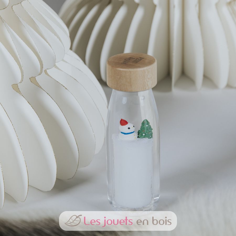 Questa bottiglia sensoriale fa parte della gamma Move Bottle. Con questa nuova linea, Petit Boum ha fatto un ulteriore passo avanti nell'esplorazione di nuovi confini sensoriali, con un nuovo liquido galleggiante che amerai. Ogni volta che la bottiglia viene agitata, il viaggio inizia! Il pupazzo di neve e l'albero iniziano a fluttuare con il cambiamento di densità del liquido, in un sogno pieno di fiocchi di neve che cattura l'immaginazione dei più piccoli e li aiuta a rilassarsi. Un invito all'esplorazione, che risveglia i sensi e la curiosità dei bambini, e li fa entrare in un mondo calmo e rilassante.