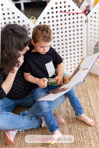 Scopri la bottiglia sensoriale Spy Jungle del marchio Petit Boum. Un giocattolo colorato per l'apprendimento precoce, ispirato alla pedagogia Montessori, che stimola i sensi dei bambini a partire dai 3 mesi.