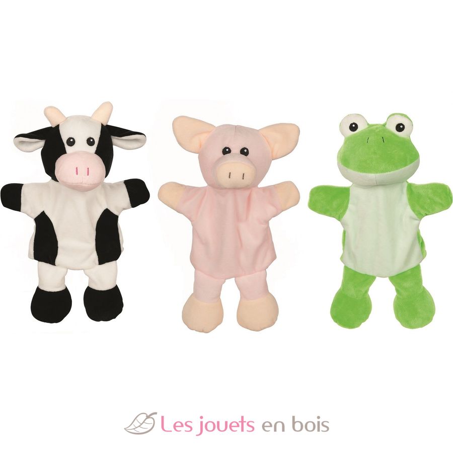 Pupazzi a mano di mucca, maiale e rana del marchio Goki. Riferimento 50959.