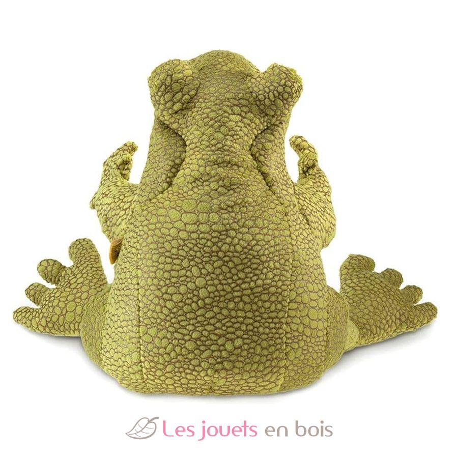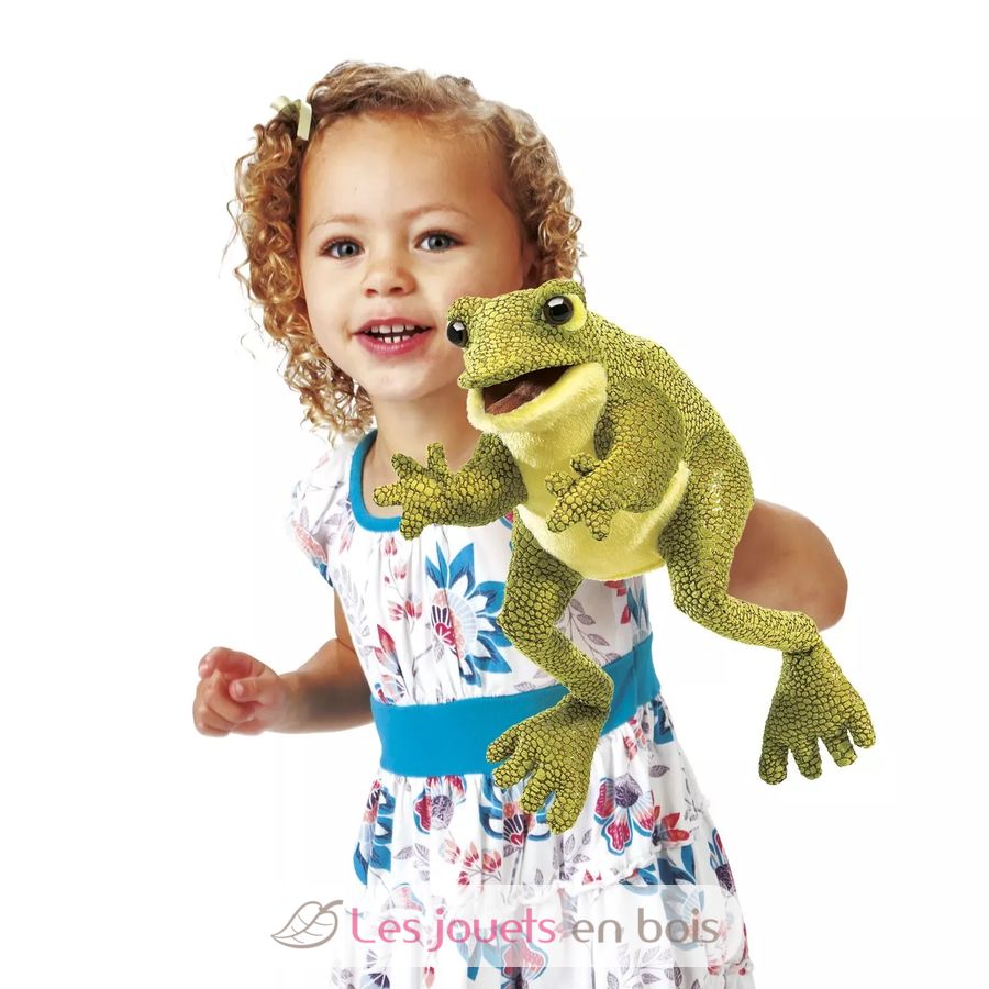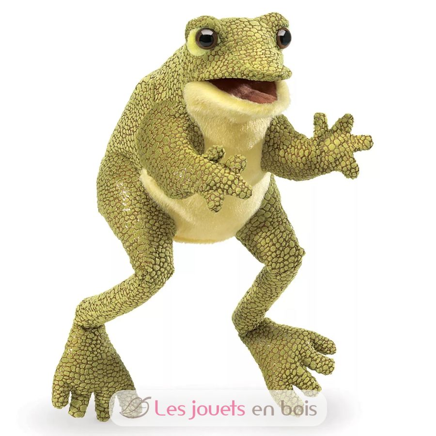 Pronta a fare marachelle, questa rana-pupazzo implora la vostra attenzione con occhi espressivi e un sorriso spalancato. Vestita con un tessuto verde alla moda e testurizzato che arriva fino ai piedi sgraziati, questa buffa creatura prende vita con la bocca e le zampe anteriori mobili.