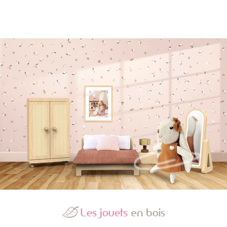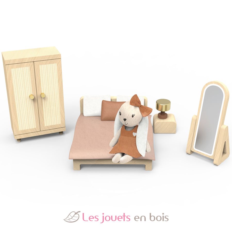Entra in un mondo di fantasia con questo set di accessori in legno per la cameretta della casa delle bambole, accompagnato da un piccolo coniglietto di stoffa (10cm).