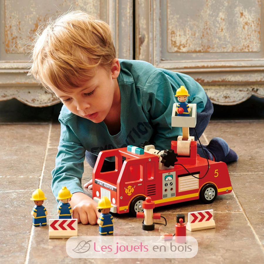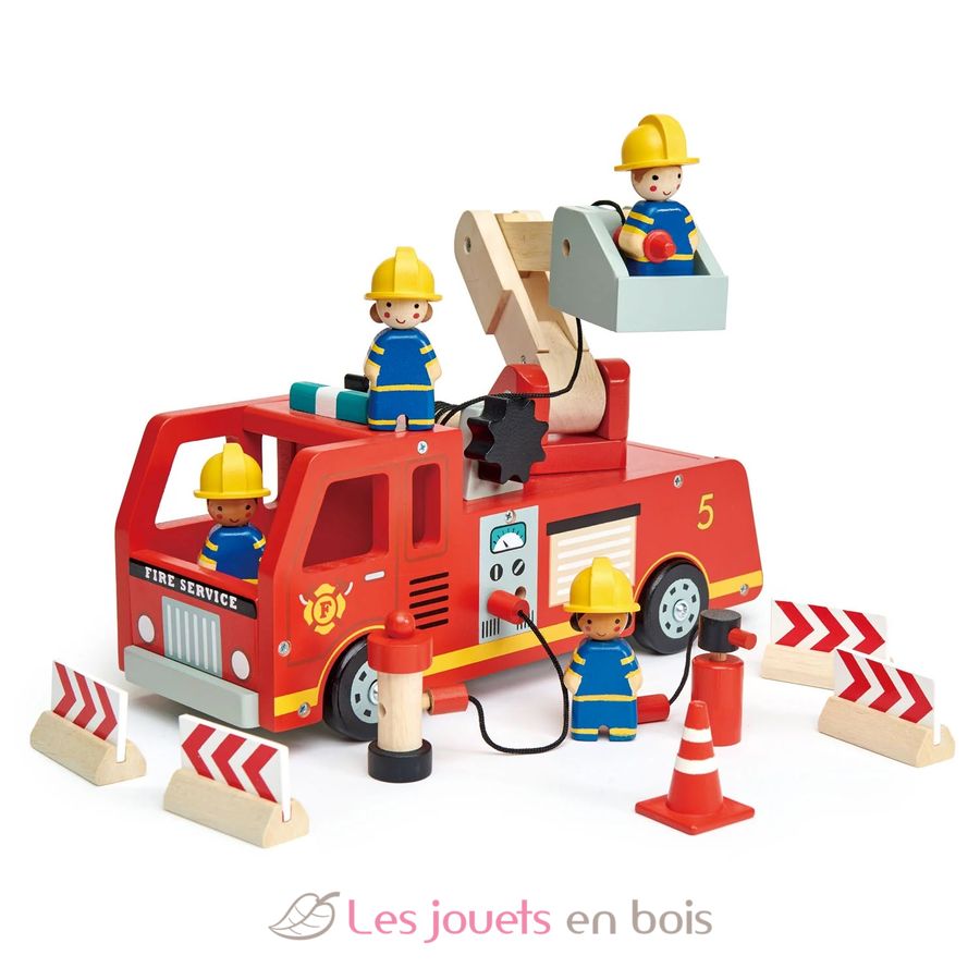 Questo camion dei pompieri è dotato di una manichetta srotolabile e di un braccio estensibile in legno naturale per portare i 4 pompieri ad altezze vertiginose per spegnere incendi o salvare un gattino!