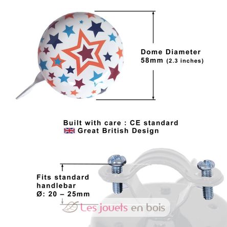 Il campanello si adatta alla maggior parte delle biciclette per bambini (manubri di diametro compreso tra 2 e 2,5 cm) e si fissa facilmente con due piccole viti.