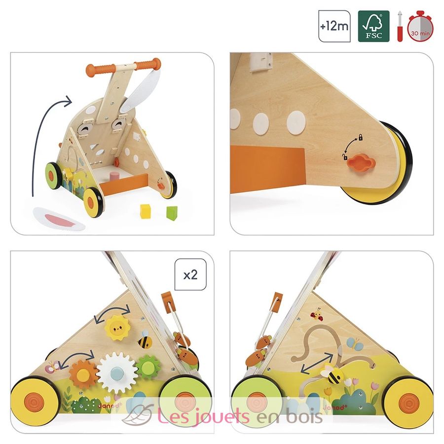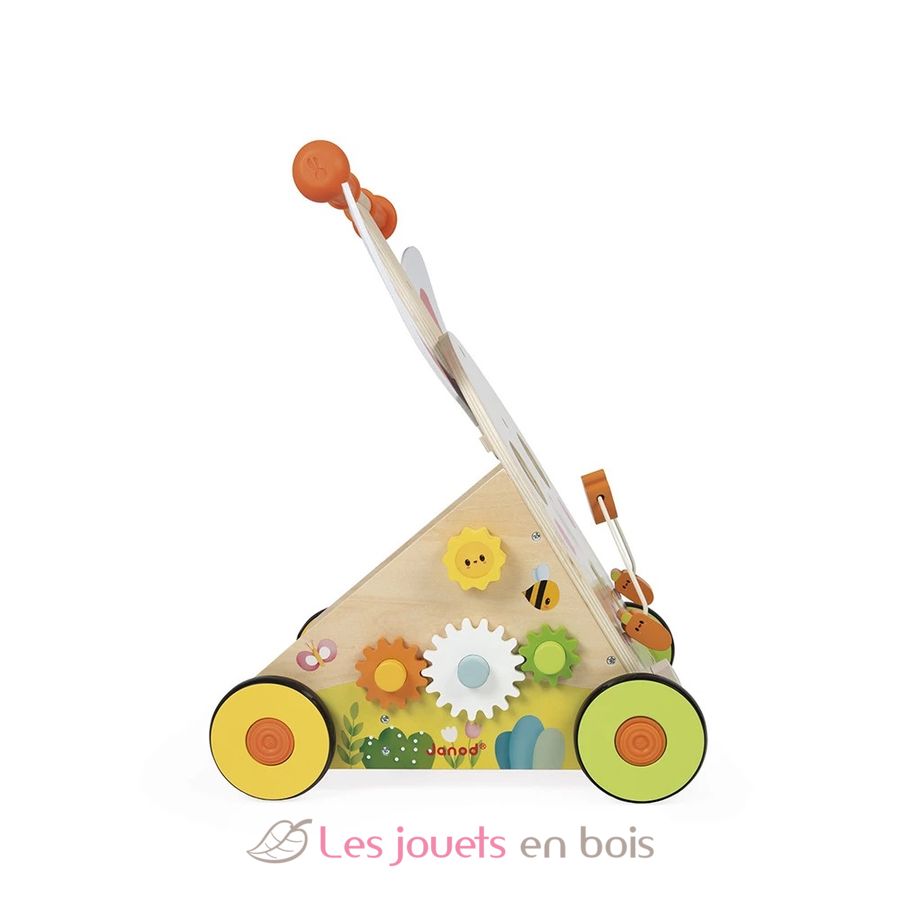 Questo carrello multiattività in legno è perfetto per i bambini da 1 anno in su, con tanti piccoli giochi su tutti e 3 i lati! Il divertimento e lo sviluppo della motricità fine e della destrezza sono garantiti dalle 9 divertenti attività del nostro coniglio birichino: circuito ad anello con le sue carote, scatola delle forme tradizionali e topolino per scivolare in un labirinto sul davanti, labirinto delle api su un lato, ingranaggi e sole sonoro sull'altro. I grandi occhi di questo coniglio ruotano e le sue guance sono in feltro, così come le sue orecchie, per sviluppare il senso del tatto del bambino.