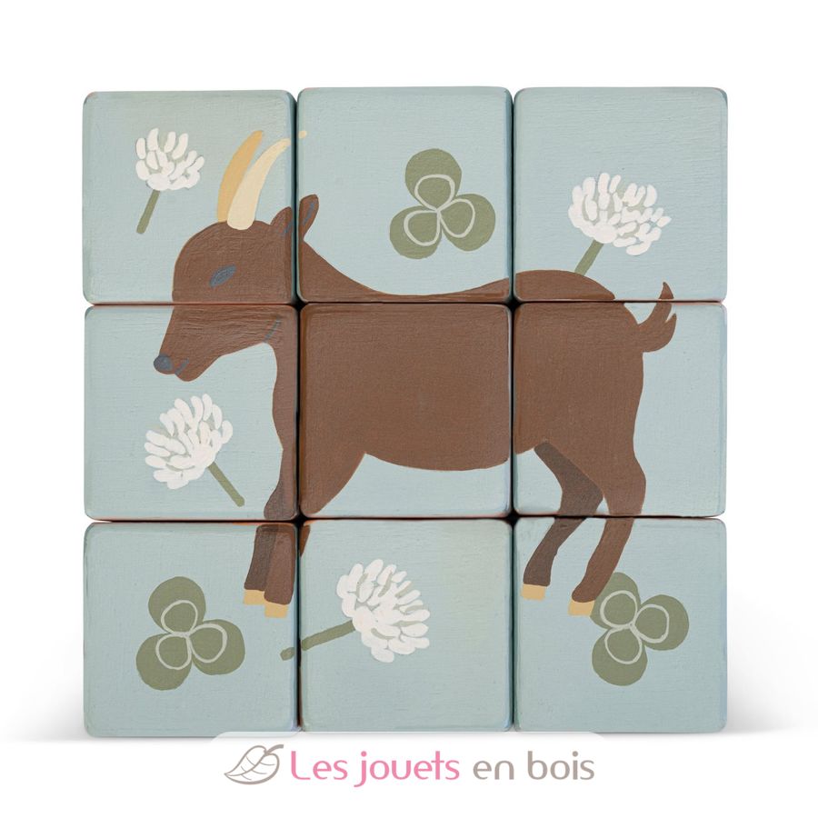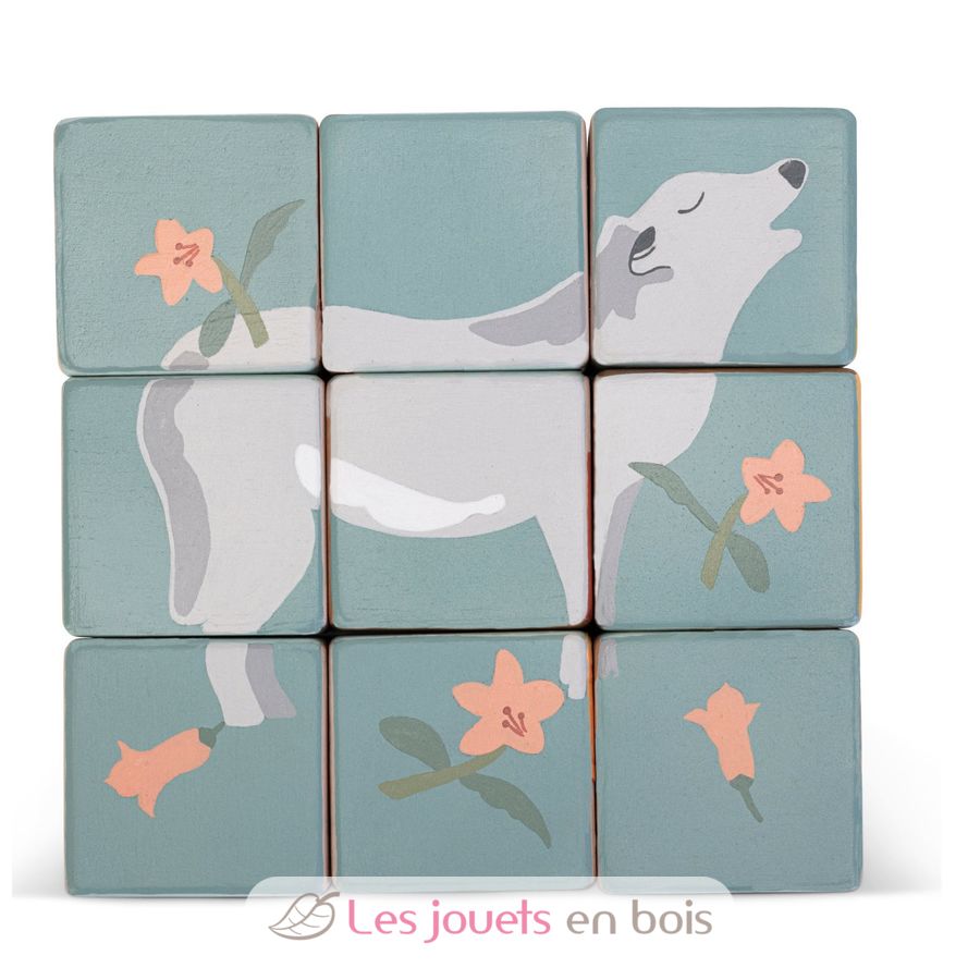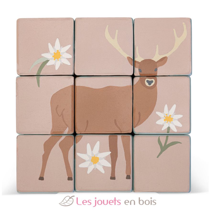 Questo puzzle è composto da 9 cubi di legno che permettono di creare 6 immagini di animali, accompagnate da specie floreali tipiche delle montagne e delle Dolomiti.
