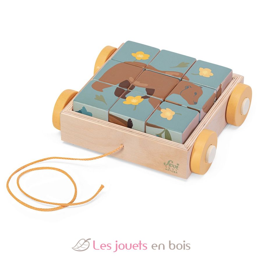 Questi cubi di legno possono essere trasportati nel carretto trainabile. Aiutano a sviluppare la coordinazione motoria, la memoria visiva e le capacità di osservazione nei bambini a partire dai 2 anni.