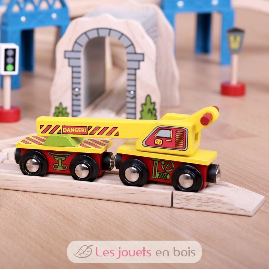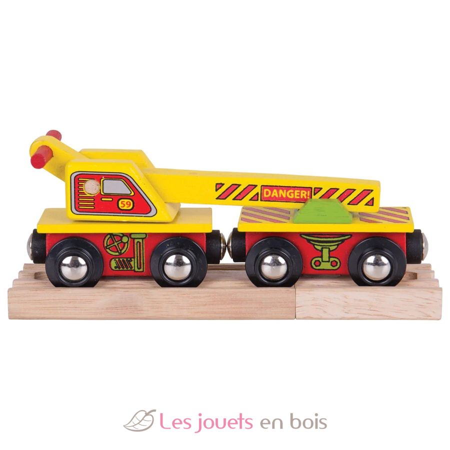 Questa gru gialla in legno è progettata per ruotare ed essere sollevata in cielo. Si compone di 2 pedine, perfette per completare il circuito del trenino in legno.