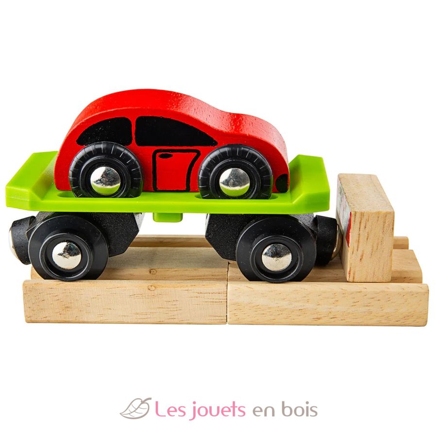 Questo carro trasporta un vagone di legno rimovibile. Il set è composto da 2 pedine, perfette per completare il circuito del trenino in legno.