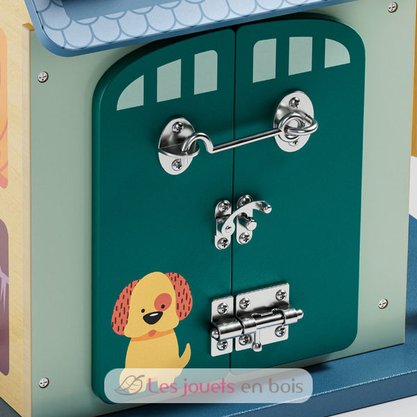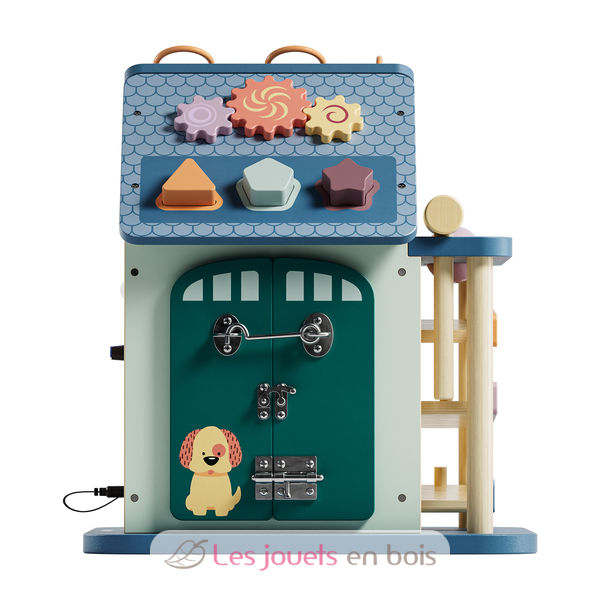 Questa divertente casa delle attività riunisce 12 diverse possibilità di gioco per stimolare in modo giocoso le capacità motorie fini e di concentrazione dei bambini a partire dai 18 mesi.