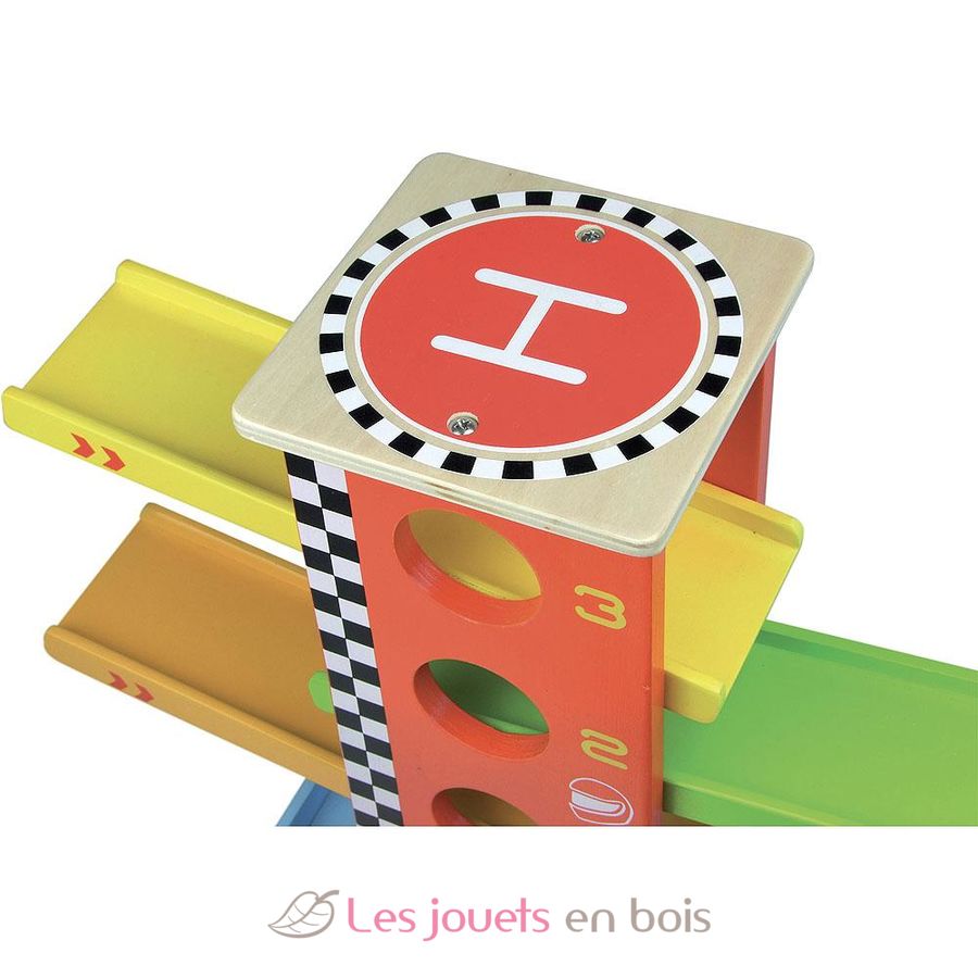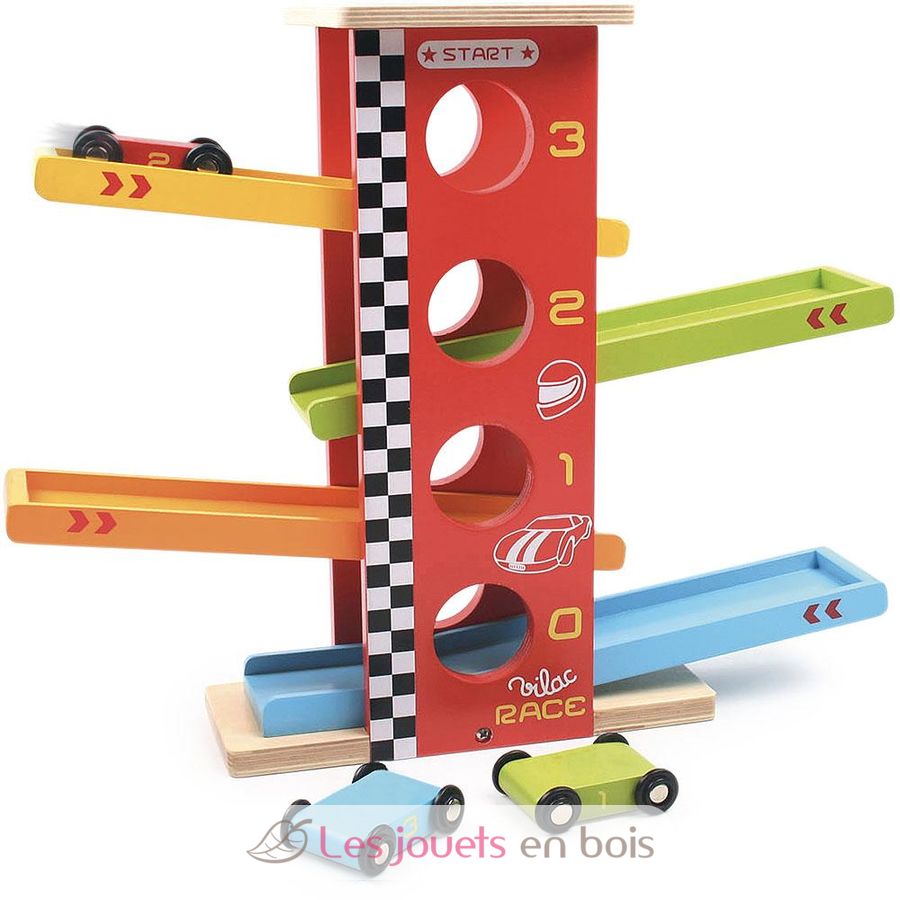 Cascata di auto da corsa in legno di Vilac. Le auto scendono dalle rampe una dopo l'altra... Sempre più veloce! Consegnato con 3 macchinine in legno di diversi colori.