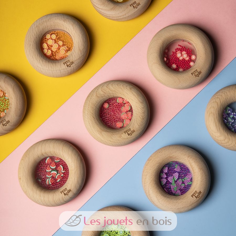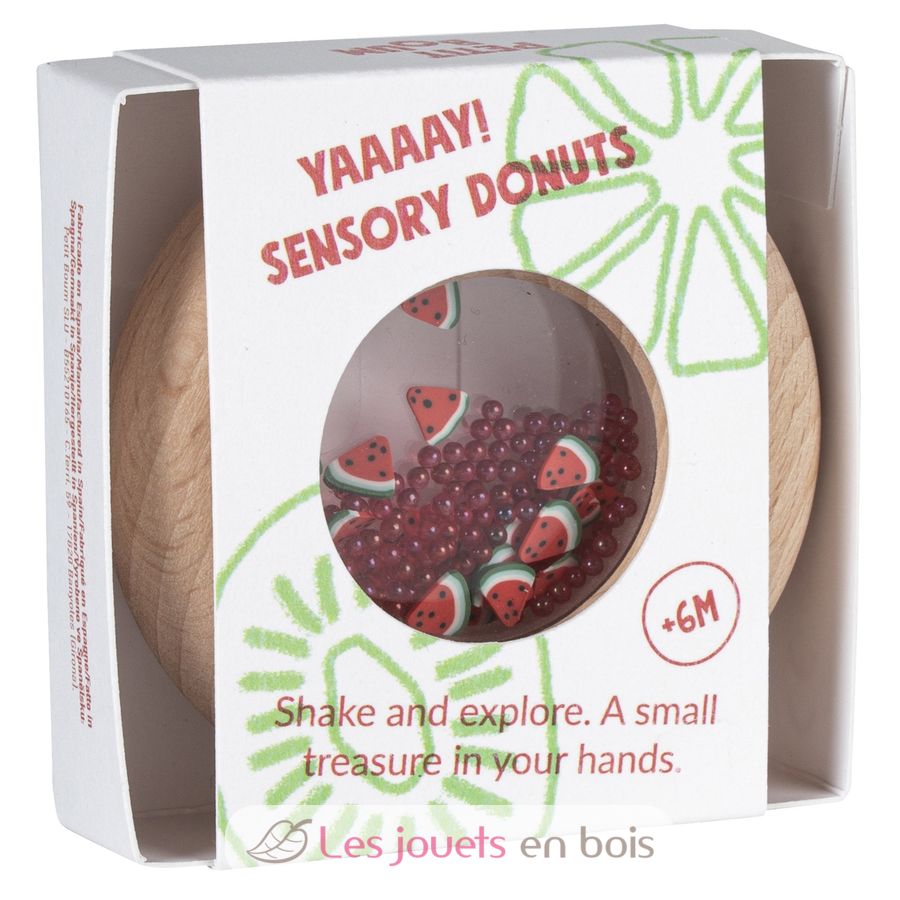 Questo giocattolo sensoriale delizierà i più piccoli, a partire dai 6 mesi. Questo sonaglio liscio in legno a forma di ciambella è perfetto per le manine dei più piccoli, che possono afferrarlo comodamente. All'interno, il bambino può identificare deliziose forme di frutta o verdura che, se scosse, scatenano un irresistibile suono sensoriale.
