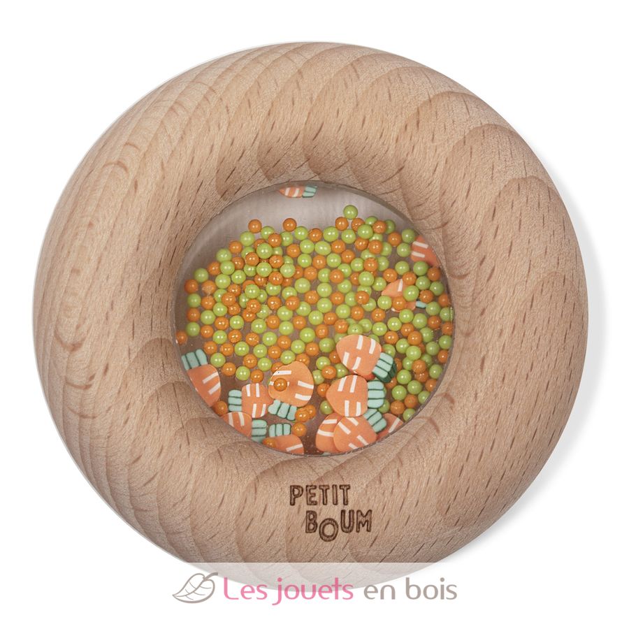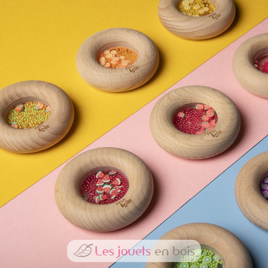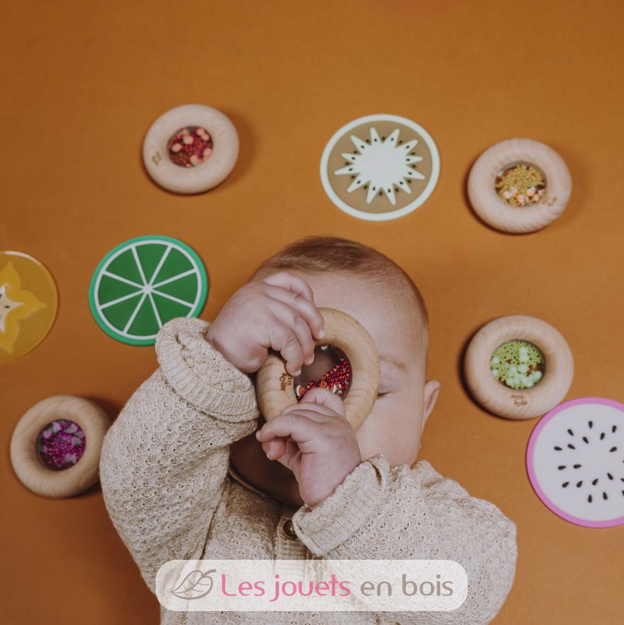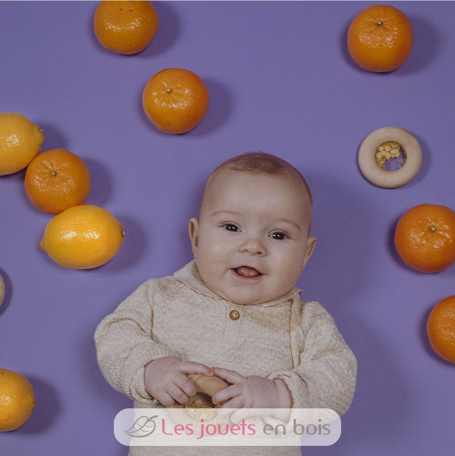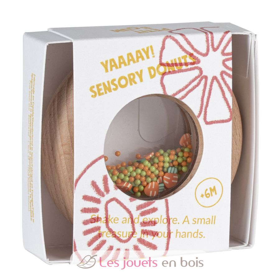 Questo giocattolo sensoriale delizierà i più piccoli, a partire dai 6 mesi. Questo sonaglio liscio in legno a forma di ciambella è perfetto per le manine dei più piccoli, che possono afferrarlo comodamente. All'interno, il bambino può identificare deliziose forme di frutta o verdura che, se scosse, scatenano un irresistibile suono sensoriale.