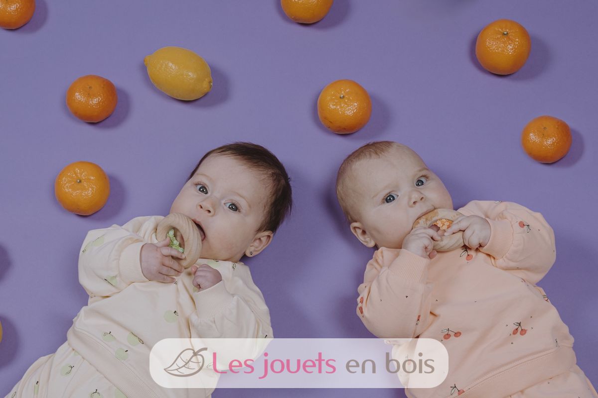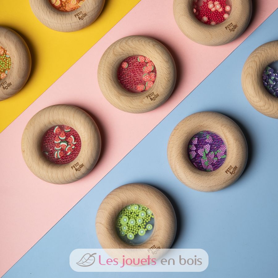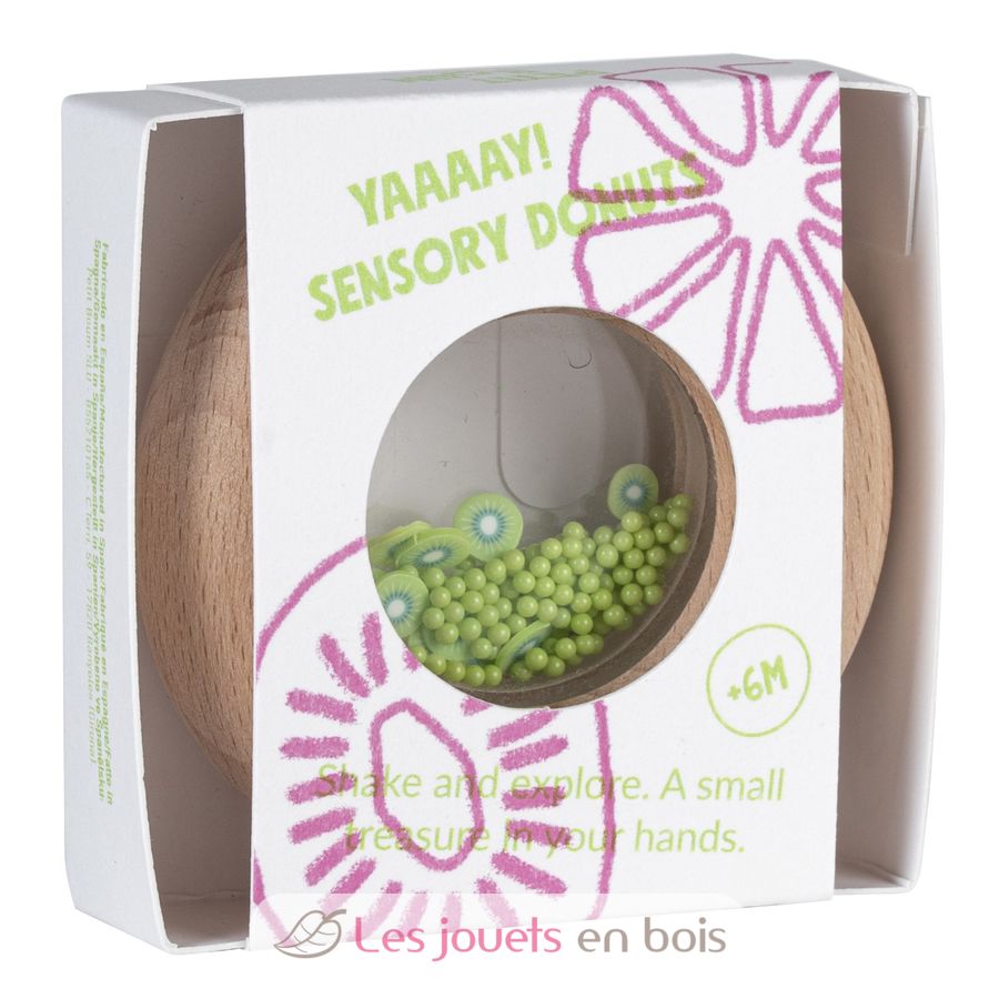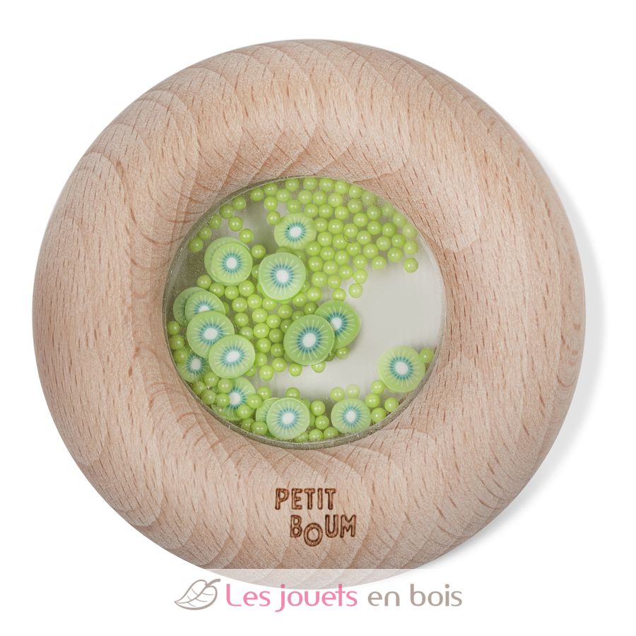 Questo giocattolo sensoriale delizierà i più piccoli, a partire dai 6 mesi. Questo sonaglio liscio in legno a forma di ciambella è perfetto per le manine dei più piccoli, che possono afferrarlo comodamente. All'interno, il bambino può identificare deliziose forme di frutta o verdura che, se scosse, scatenano un irresistibile suono sensoriale.