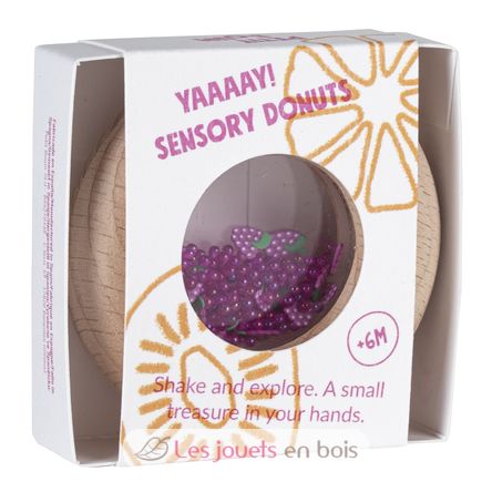 Questo giocattolo sensoriale delizierà i più piccoli, a partire dai 6 mesi. Questo sonaglio liscio in legno a forma di ciambella è perfetto per le manine dei più piccoli, che possono afferrarlo comodamente. All'interno, il bambino può identificare deliziose forme di frutta o verdura che, se scosse, scatenano un irresistibile suono sensoriale.