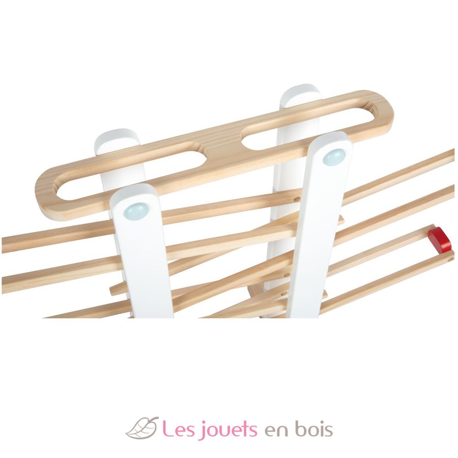 Questo circuito in legno massiccio, in formato XL, promette un'azione rapida quando le 3 palline di legno rotolano lungo le 4 rampe.