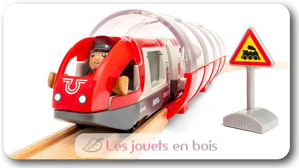 Iniziate il vostro viaggio nella grande stazione centrale, dove i passeggeri possono prendere l'ascensore o le scale per spostarsi tra le linee di autobus e treni. Poi viaggiate lungo i binari di legno con il treno rosso o la metropolitana gialla. È possibile aggiungere al gioco molti accessori ferroviari, tra cui una luce di attraversamento illuminata, un passaggio a livello o altri accessori Brio.