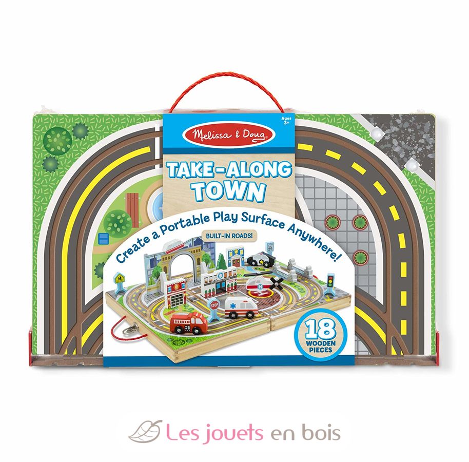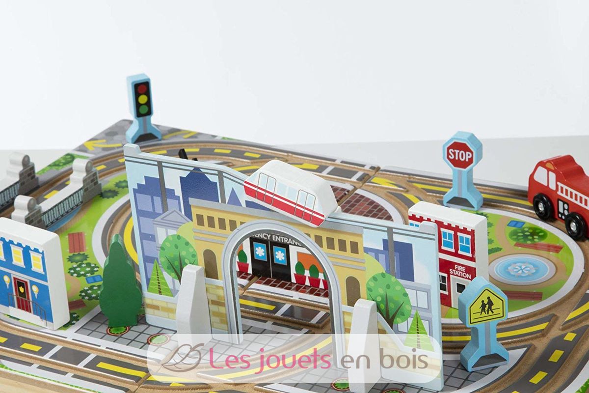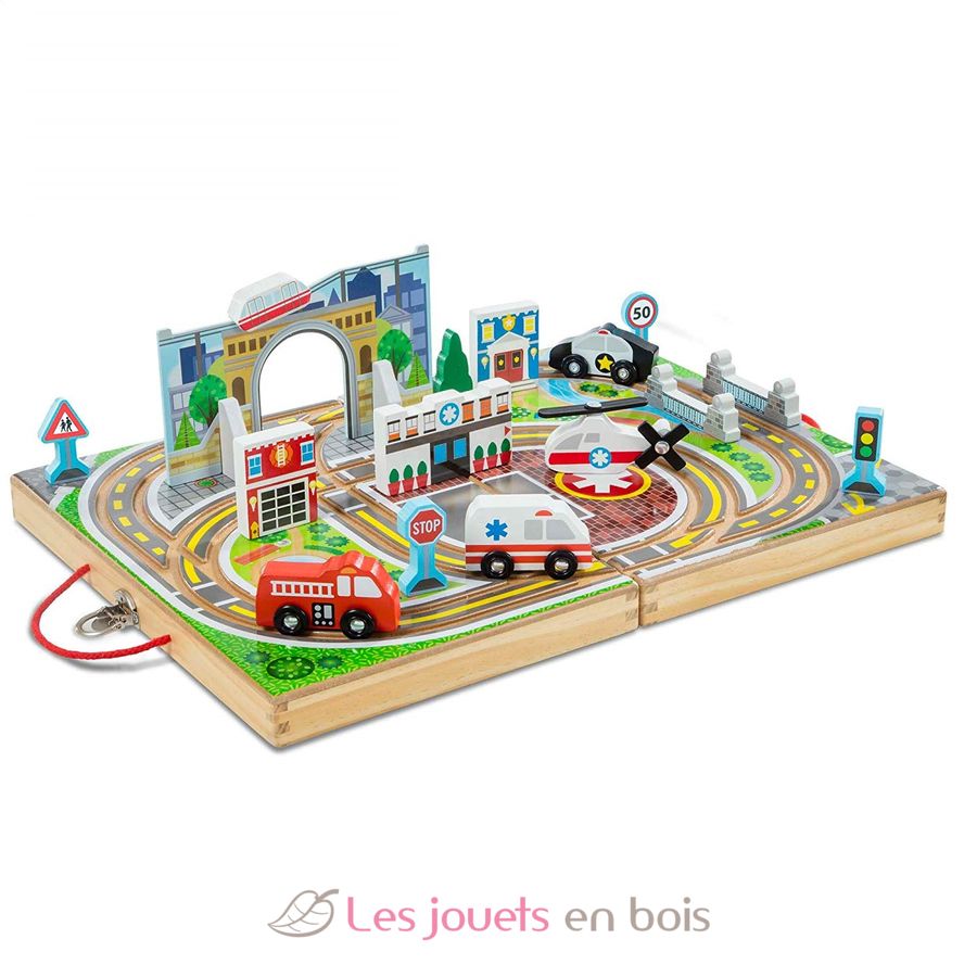 Creare un parco giochi ovunque! Questo set in legno con strade integrate comprende 4 veicoli di soccorso, un albero, 4 segnali stradali, supporti, un tunnel e 3 edifici. Una pista per auto da città e da valigia che il bambino può portare ovunque!