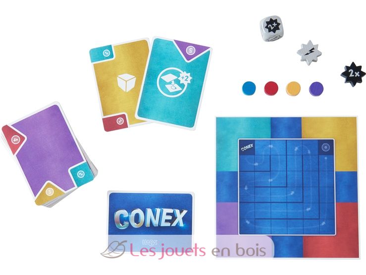 Igiocatori cercano i posti migliori per mettere le loro carte angolo CONEX di alto valore. Attenzione: in questo gioco l'acutezza visiva è messa a dura prova! Inoltre, dovrete utilizzare le stelle azione ottenute dai dadi come strateghi, ma senza ritardi! Solo coloro che mantengono una visione d'insieme diventano maestri del CONEX.