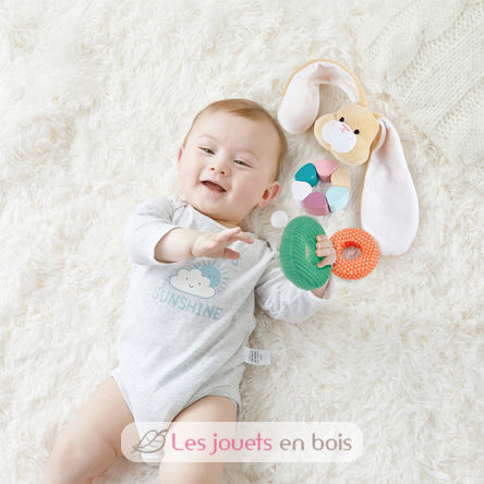 Questo gioco ad anelli impilabili a forma di coniglio è ideale per svegliare i più piccoli a partire dai 10 mesi.