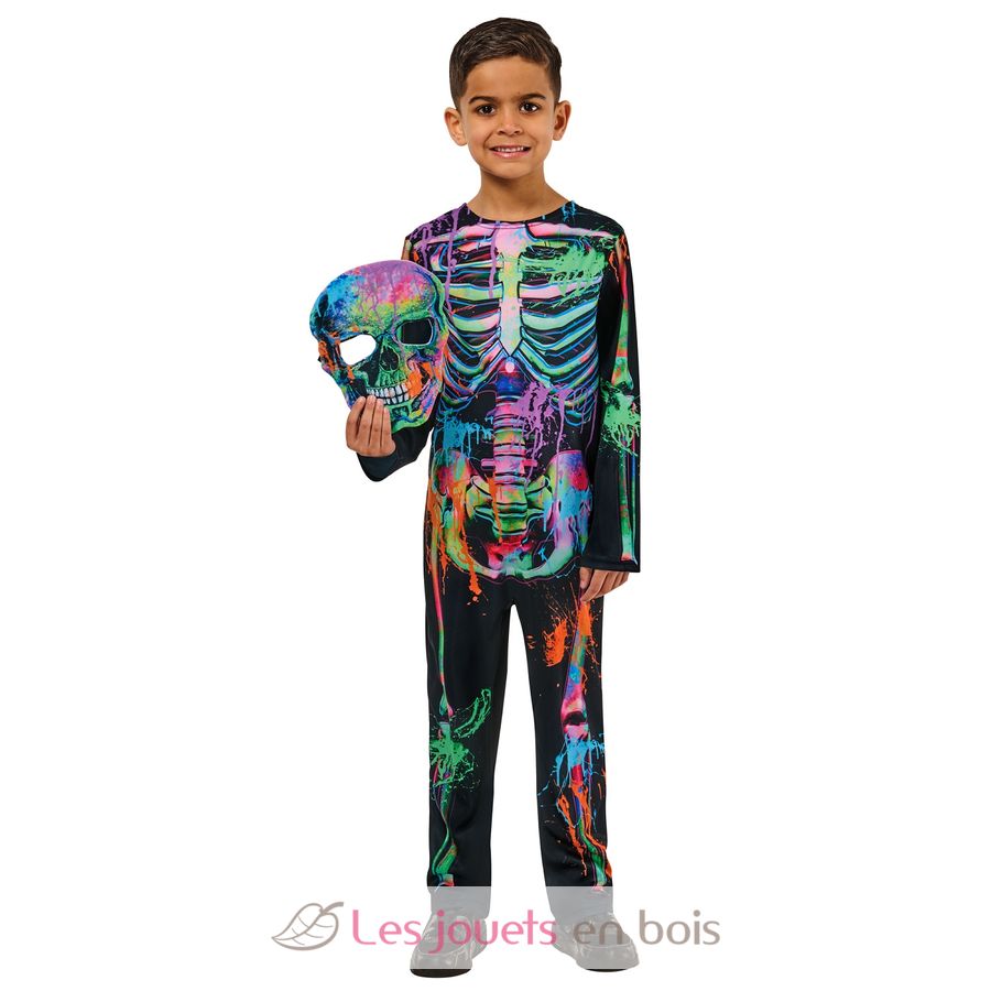 Questo costume per bambini include una tuta nera con motivi stampati a forma di scheletro e una maschera da scheletro.