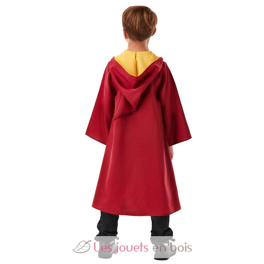 Questo costume per bambini include un mantello da Quidditch in tessuto rosso e giallo con cappuccio integrato, lo stemma di Grifondoro stampato sul petto, lacci sul davanti e una maglia stampata integrata nel mantello.