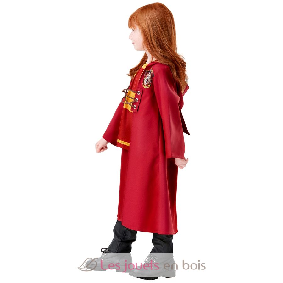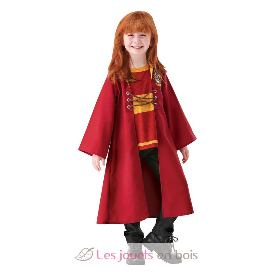Questo costume per bambini include un mantello da Quidditch in tessuto rosso e giallo con cappuccio integrato, lo stemma di Grifondoro stampato sul petto, lacci sul davanti e una maglia stampata integrata nel mantello.