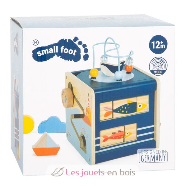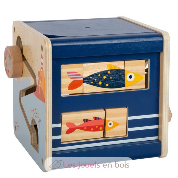 Con due anelli motricità, un gioco di forme, un labirinto scorrevole e un gioco di alette rotanti su cinque superfici di gioco, questo cubo motricità marittimo in legno robusto è davvero multifunzionale per giocare, imparare e scoprire! Il cubo di gioco, realizzato con colori moderni e un alto contenuto di legno naturale visibile, allena la percezione delle forme e dei colori, promuove la destrezza e la motricità fine, migliora la coordinazione occhio-mano e stimola l'immaginazione. Forti contrasti di colore e uno specchio stimolano nel bambino il senso della vista e la consapevolezza di sé. Il coperchio rimovibile può essere riposto nel cubo in modalità salva-spazio.