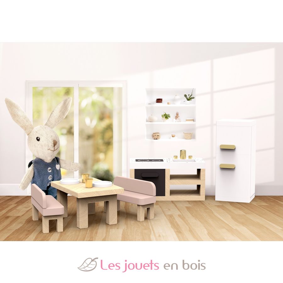 Entra in un mondo di fantasia con questo set di accessori in legno per la cucina della casa delle bambole, accompagnato da un piccolo coniglietto di stoffa (10cm).