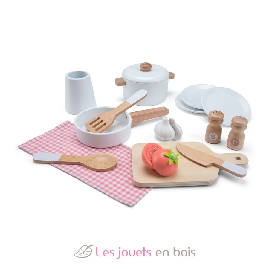 I piccoli chef possono preparare deliziosi pasti per i loro ospiti dai 3 anni in su, grazie ai 16 accessori in legno inclusi: 3 piatti, 1 padella, 1 pentola con coperchio, 1 canovaccio, saliera e pepiera, 1 tagliere, 1 pomodoro, 1 spicchio d'aglio, 1 coltello, 1 cucchiaio, 1 spatola e 1 portautensili.