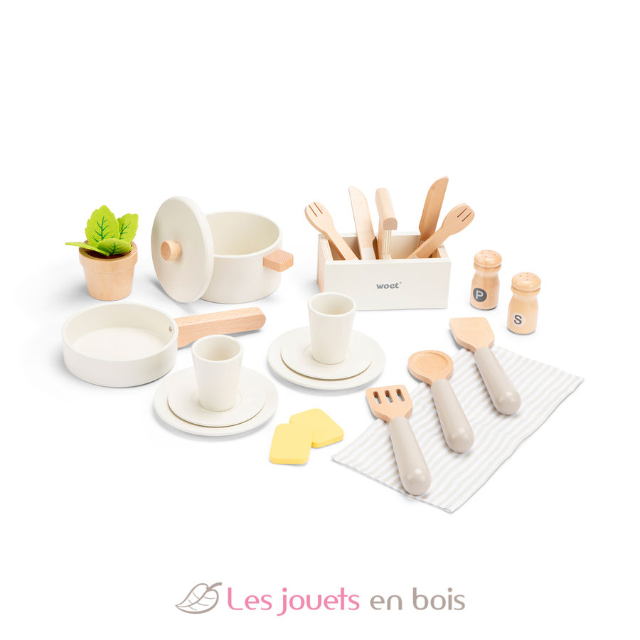 Il giocattolo include oltre 20 accessori in legno, tra cui pentole e padelle, piatti, utensili e un'erba aromatica in vaso di legno, per ore di gioco significativo.