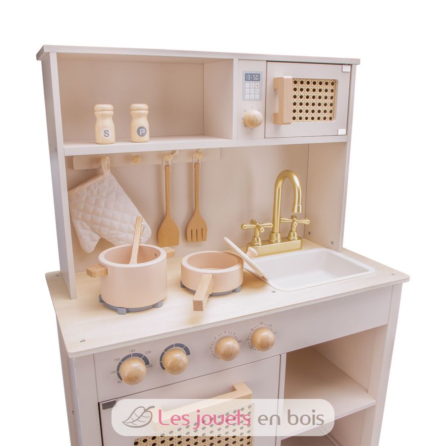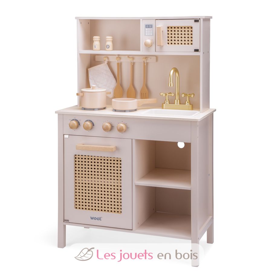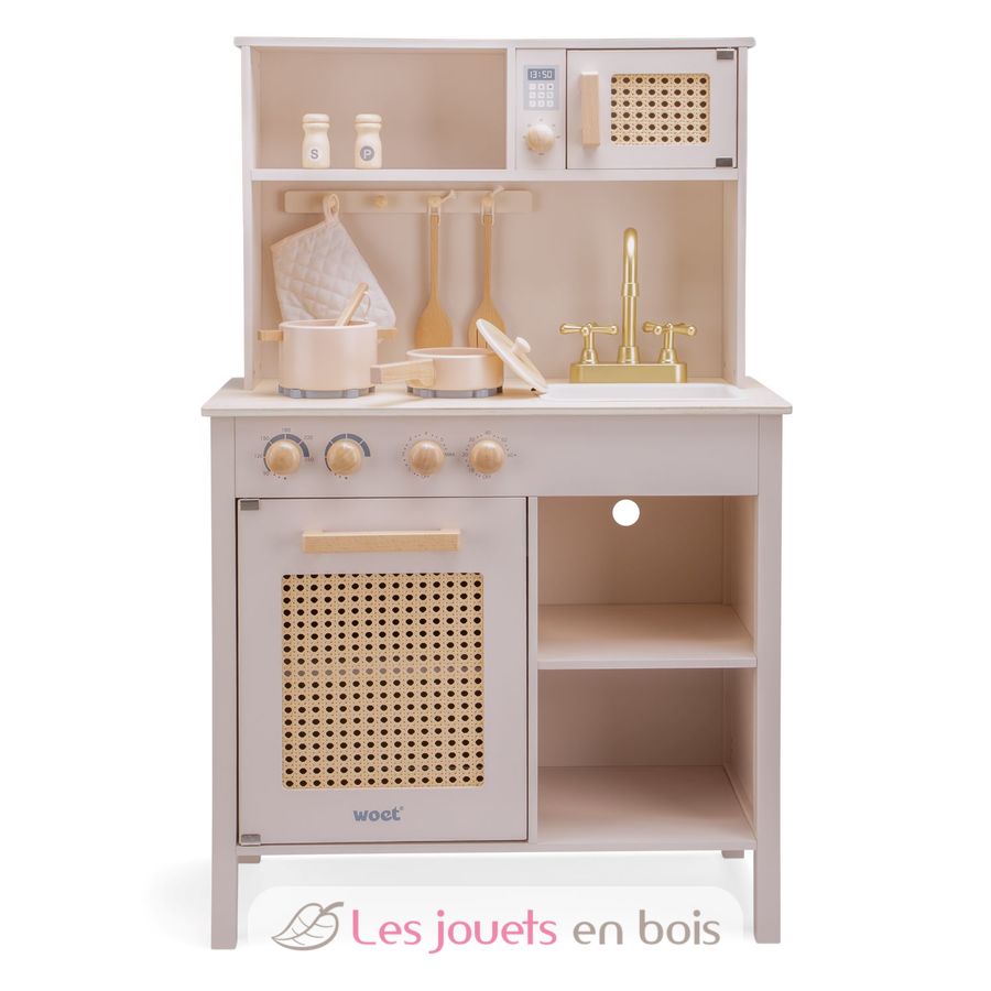 Questa cucina in legno e rattan è dotata di un piano di lavoro con 2 piastre elettriche, un forno e un microonde per cucinare e riscaldare le stoviglie, un lavello e un rubinetto per fingere di lavare e pulire.