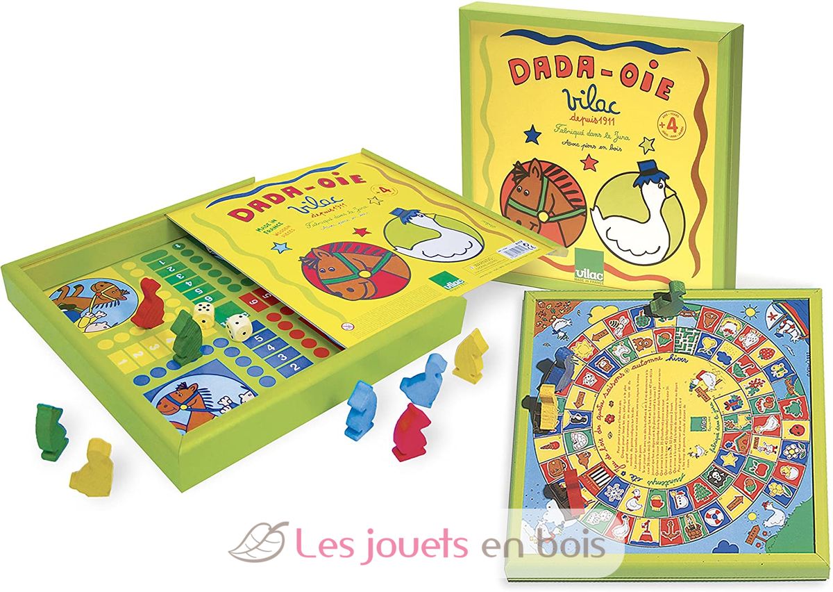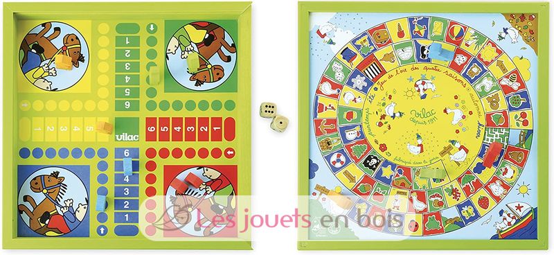 Un grazioso gioco dell'oca e un gioco di cavallini in una solida scatola di legno. Sotto il coperchio di legno di questa scatola, due giochi da tavolo essenziali per i più piccoli. Questo gioco da tavolo di alta qualità è prodotto nella regione del Giura in Francia da Vilac. Ref 6117
