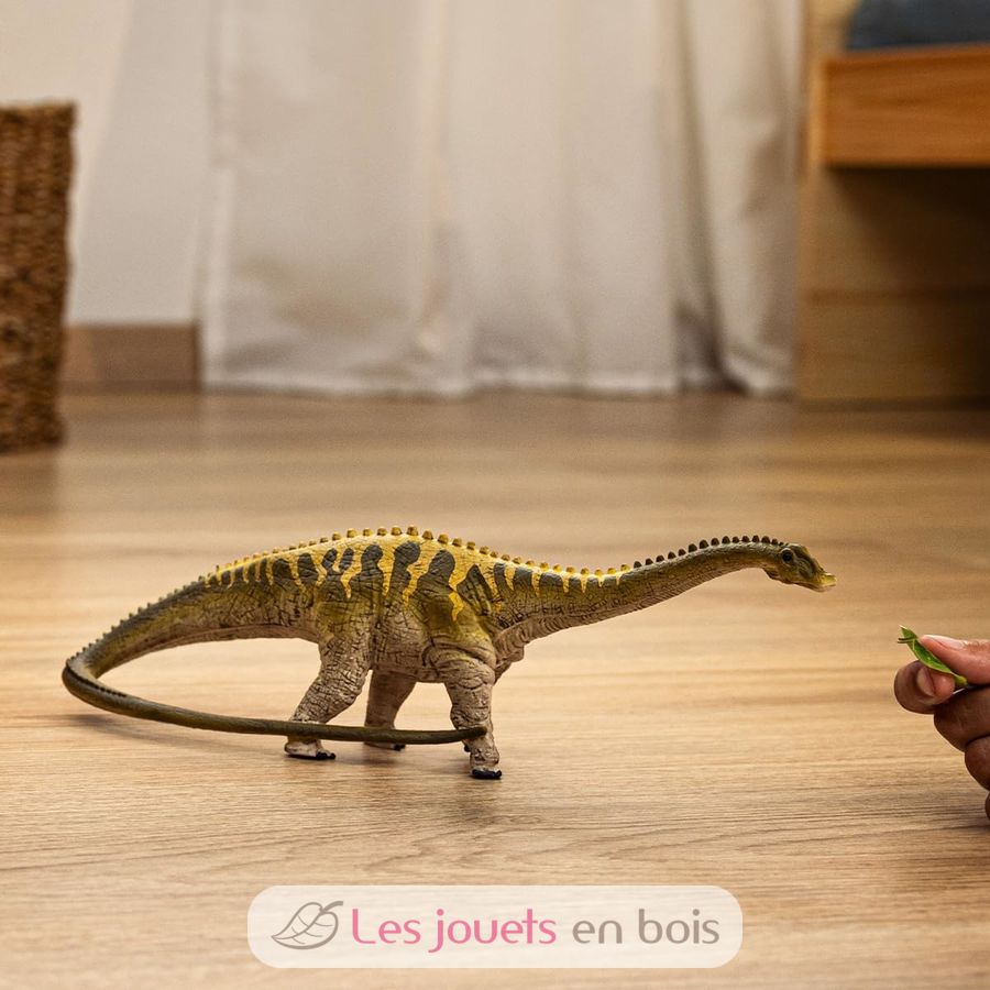 Il diplodoco è un gigante preistorico: misura 27 metri di lunghezza, di cui sei metri solo per il suo immenso collo. Inoltre, nonostante sia vegetariano, può pesare fino a 16 tonnellate! Grazie alla sua bocca larga, deve masticare faticosamente i rami per ore prima di essere finalmente soddisfatto. Questa attività lo terrà impegnato per un po'!