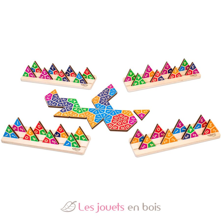 Contenuto: 4 tavole da 17,5 x 5 x 0,9 cm, 56 tessere triangolari da 3,5 x 3 x 0,5 cm, regolamento. Per 2-4 giocatori. Dai 6 anni in su.