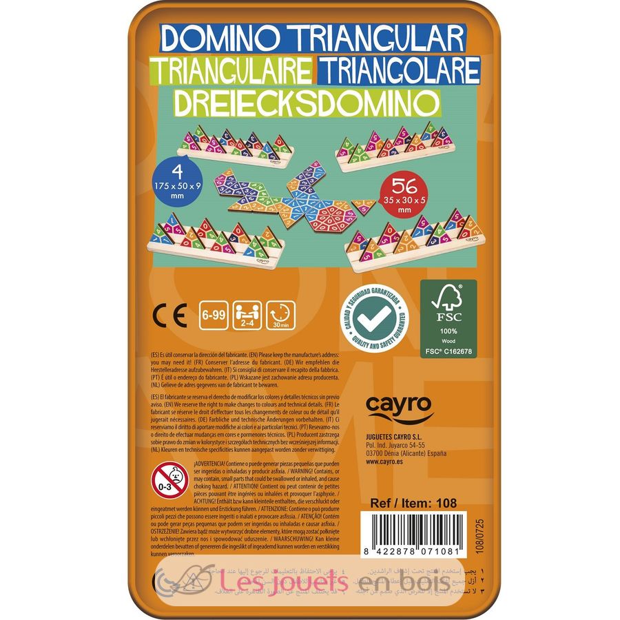 Realizzato in legno, questo giocco di domino triangolari da viaggio, consegnato nella sua scatola di metallo, è ideale per il divertimento in famiglia.