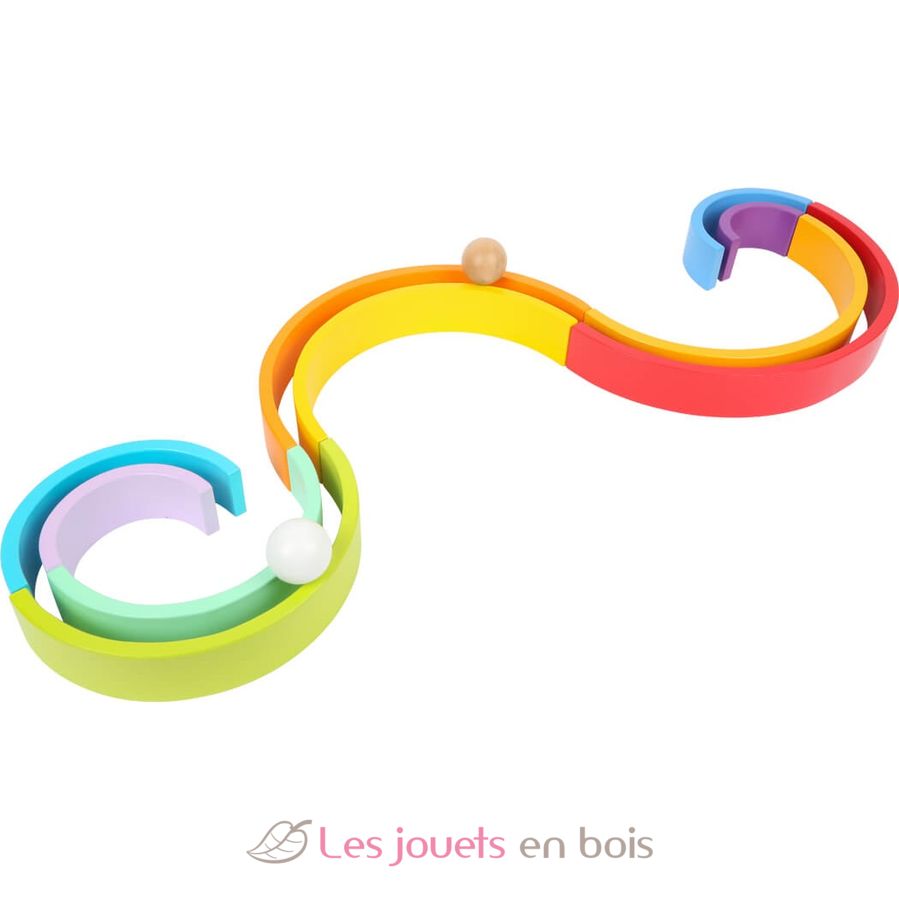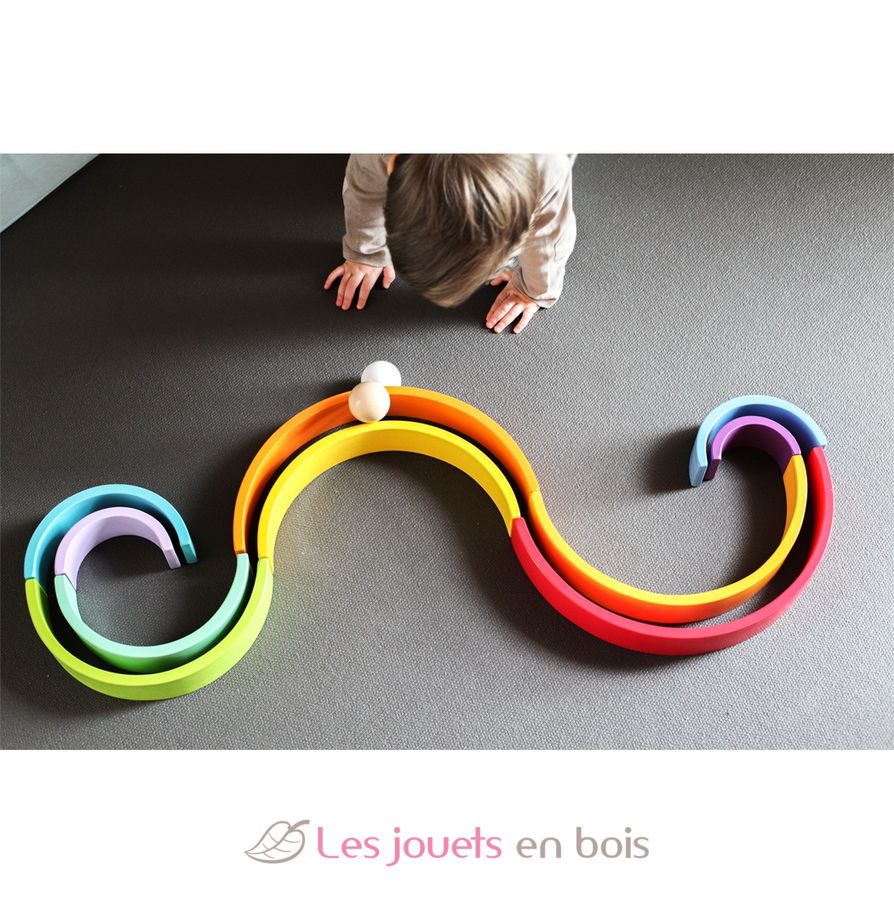Questo robusto arcobaleno in legno include 2 palline ed è verniciato con colori vivaci. Versatile, può essere utilizzato per una varietà di giochi creativi, costruendo torri, ponti, case e ostacoli. I blocchi possono essere impilati, ordinati o addirittura posizionati in fila per creare un percorso per le due palline.