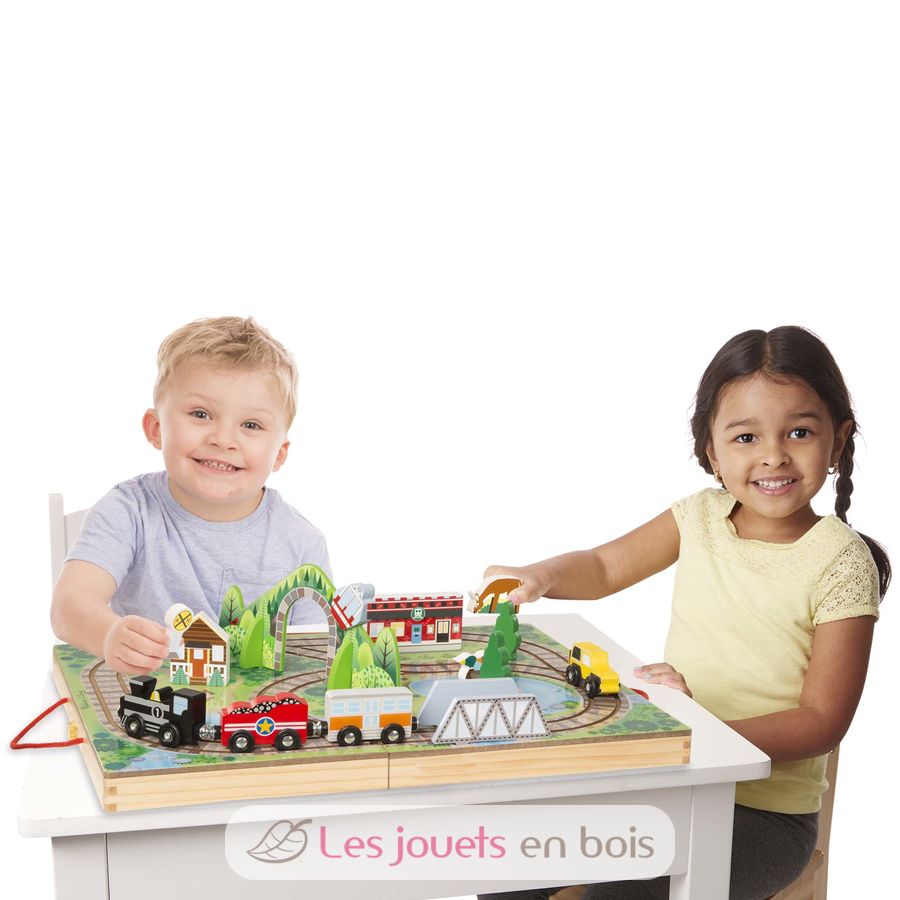 Creare un'area giochi ovunque! Questo set in legno con binari incorporati comprende 3 vagoni, 1 veicolo ranger, 2 alberi, 2 animali, 1 cartello, 1 gondola, 1 tunnel e 2 edifici. Un piccolo treno in valigia che il bambino può portare ovunque!