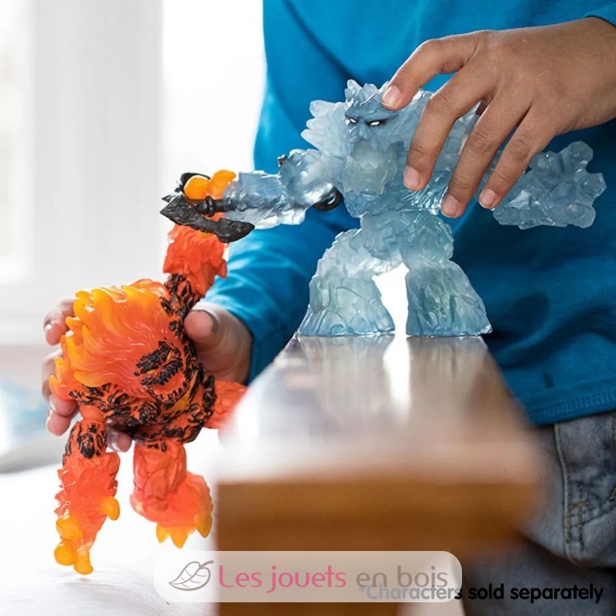 Il Demone di Lava di Schleich Eldrador Creatures emette un calore così intenso che (quasi) nessuno osa avvicinarsi. Infatti, gli aggressori sanno che qualsiasi cosa tocchi il gigante fiammeggiante prende fuoco. Il suo enorme corpo è fatto di roccia vulcanica fusa e la sua testa è coronata da una criniera incandescente. Nonostante il suo aspetto imponente, il Demone di Lava è estremamente agile, il che lo rende un avversario formidabile: poiché può ruotare l'intero busto, nessun movimento gli sfugge. Chiunque si avvicini viene immediatamente identificato. Grazie alle sue braccia articolate, afferra i suoi nemici alla velocità della luce e li scuote vigorosamente. Il Demone di Lava può anche muovere la mascella: non appena apre la bocca, eruttano fiamme e un al