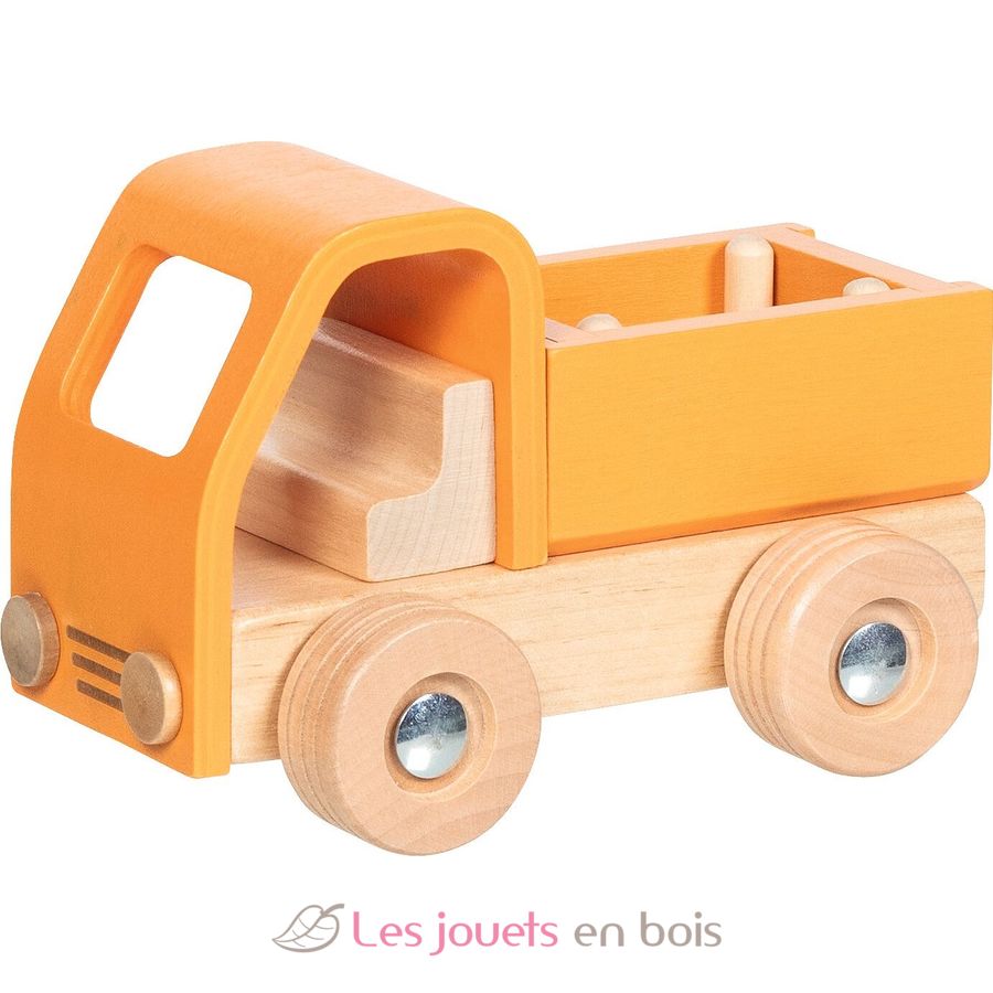 Furgone con pianale arancione, veicolo in legno della marca Goki.