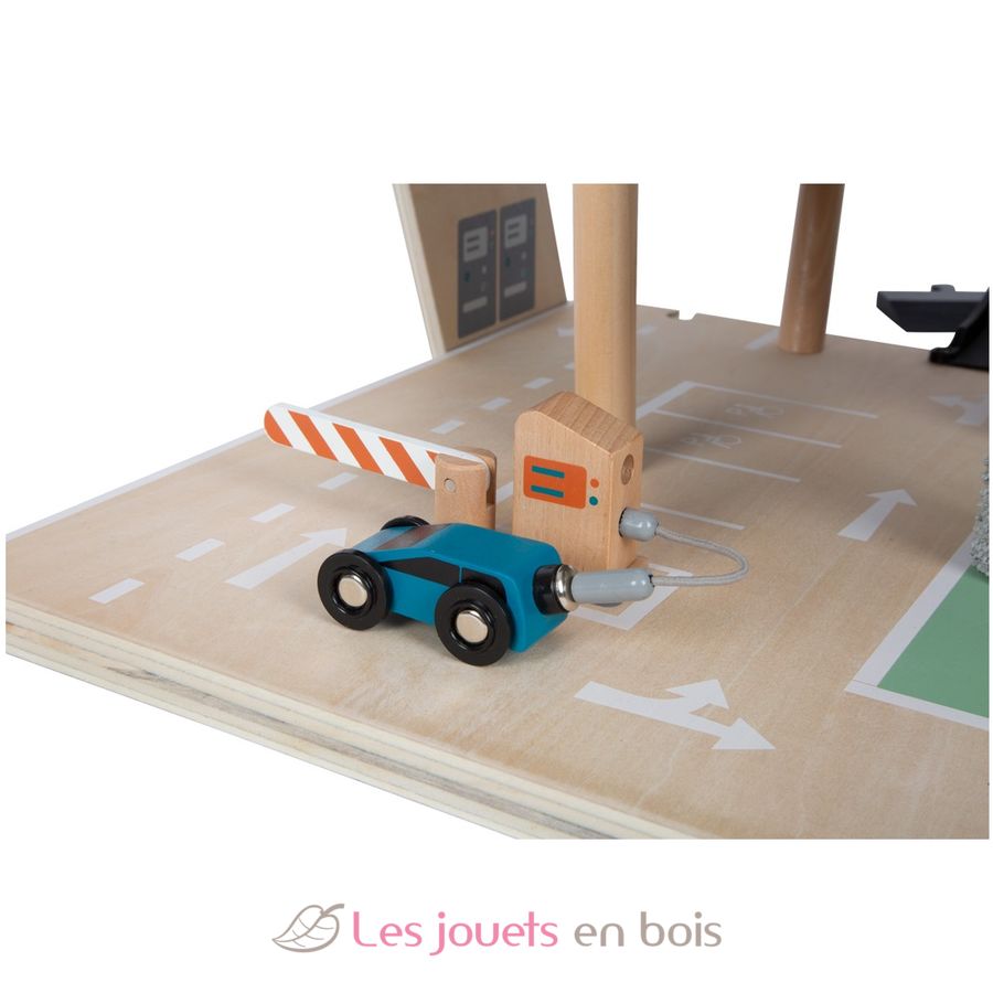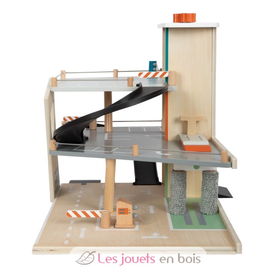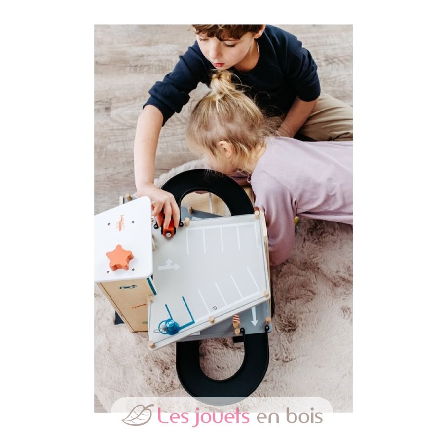 Poiché il parcheggio multipiano è dotato di punti di collegamento e rampe di accesso, può essere integrato in modo ideale negli esistenti mondi di gioco per bambini, collegando binari ferroviari in legno standard o piccoli elementi di strada pedonale.